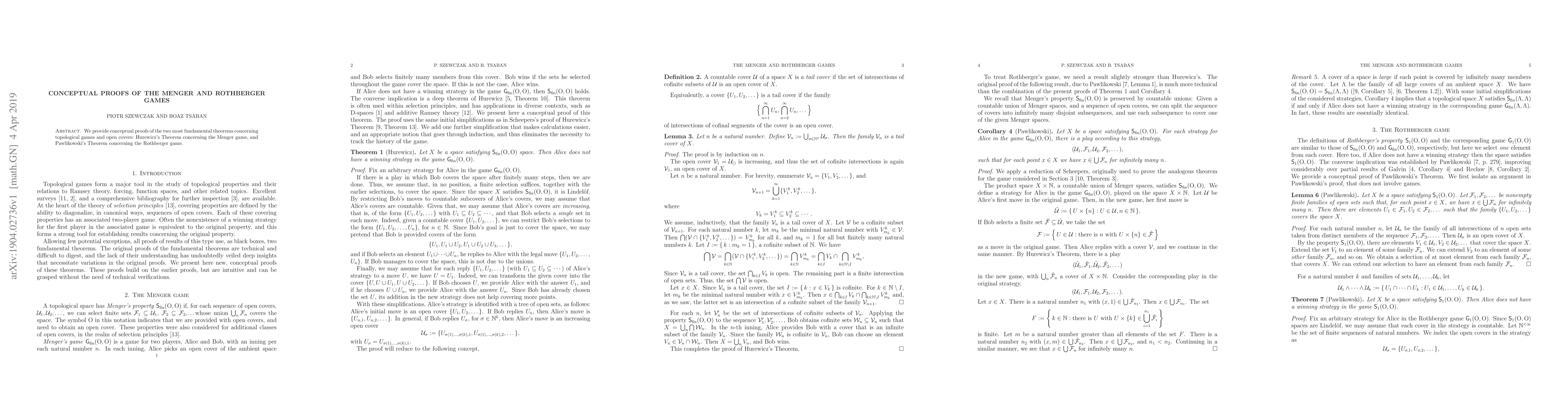 The paper provides conceptual proofs for Hurewicz's Theorem concerning the Menger game and Pawlikowski's Theorem concerning the Rothberger game, using simplifications and induction to eliminate the need to track the game's history.