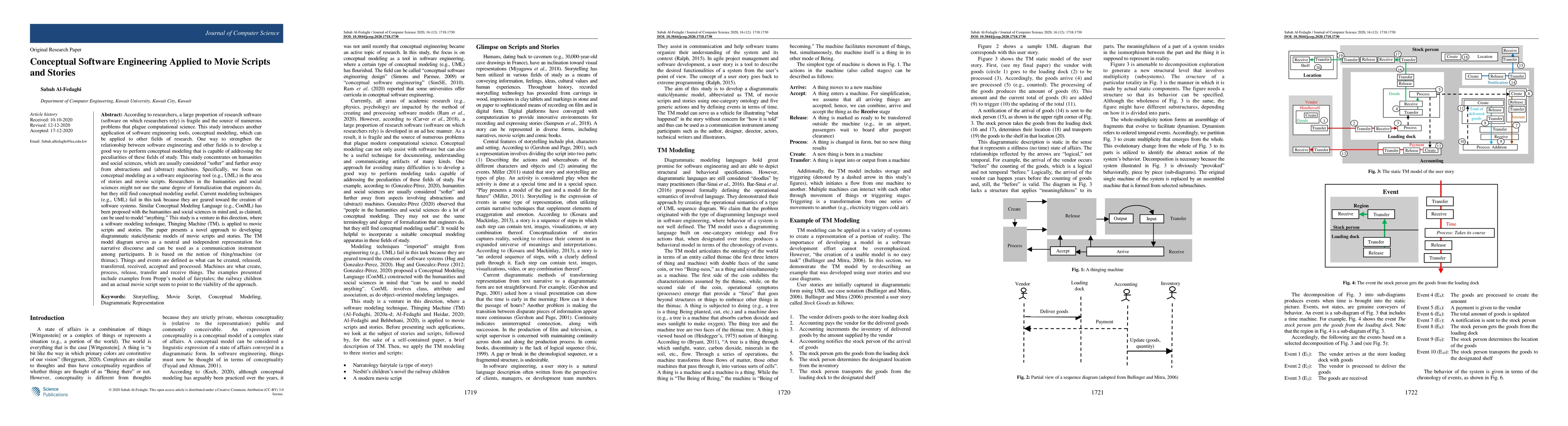 This study introduces another application of software engineering tools, conceptual modeling, which can be applied to other fields of research. One way to strengthen the relationship between software engineering and other fields is to develop a good way to perform conceptual modeling that is capable of addressing the peculiarities of these fields of study. This study concentrates on humanities and social sciences, which are usually considered softer and further away from abstractions and (abstract) machines. Specifically, we focus on conceptual modeling as a software engineering tool (e.g., UML) in the area of stories and movie scripts. Researchers in the humanities and social sciences might not use the same degree of formalization that engineers do, but they still find conceptual modeling useful. Current modeling techniques (e.g., UML) fail in this task because they are geared toward the creation of software systems. Similar Conceptual Modeling Language (e.g., ConML) has been proposed with the humanities and social sciences in mind and, as claimed, can be used to model anything. This study is a venture in this direction, where a software modeling technique, Thinging Machine (TM), is applied to movie scripts and stories. The paper presents a novel approach to developing diagrammatic static/dynamic models of movie scripts and stories. The TM model diagram serves as a neutral and independent representation for narrative discourse and can be used as a communication instrument among participants. The examples presented include examples from Propp s model of fairytales; the railway children and an actual movie script seem to point to the viability of the approach.