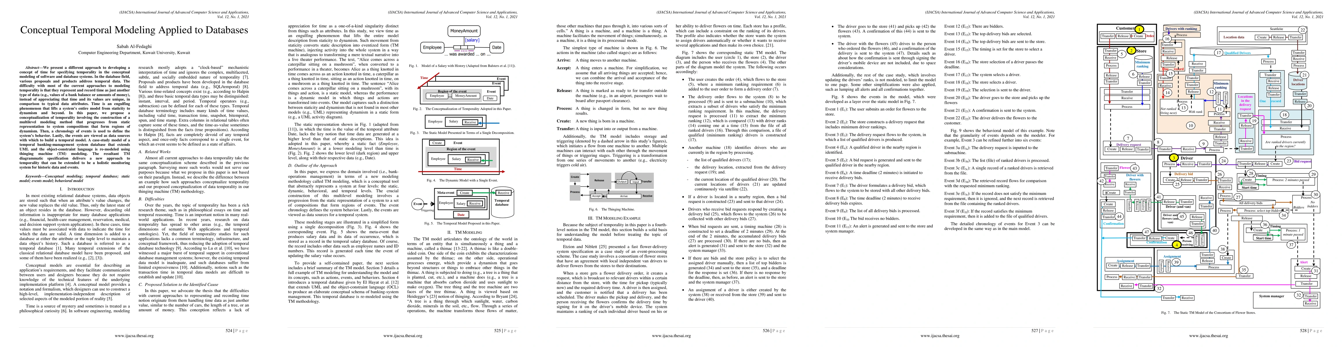 We present a different approach to developing a concept of time for specifying temporality in the conceptual modeling of software and database systems. In the database field, various proposals and products address temporal data. The difficulty with most of the current approaches to modeling temporality is that they represent and record time as just another type of data (e.g., values of a bank balance or amounts of money), instead of appreciating that time and its values are unique, in comparison to typical data attributes. Time is an engulfing phenomenon that lifts a system s entire model from staticity to dynamism and beyond. In this paper, we propose a conceptualization of temporality involving the construction of a multilevel modeling method that progresses from static representation to system compositions that form regions of dynamism. Then, a chronology of events is used to define the system s behavior. Lastly, the events are viewed as data sources with which to build a temporal model. A case-study model of a temporal banking-management system database that extends UML and the object-constraint language is re-modeled using thinging machine (TM) modeling. The resultant TM diagrammatic specification delivers a new approach to temporality that can be extended to be a holistic monitoring system for historic data and events.