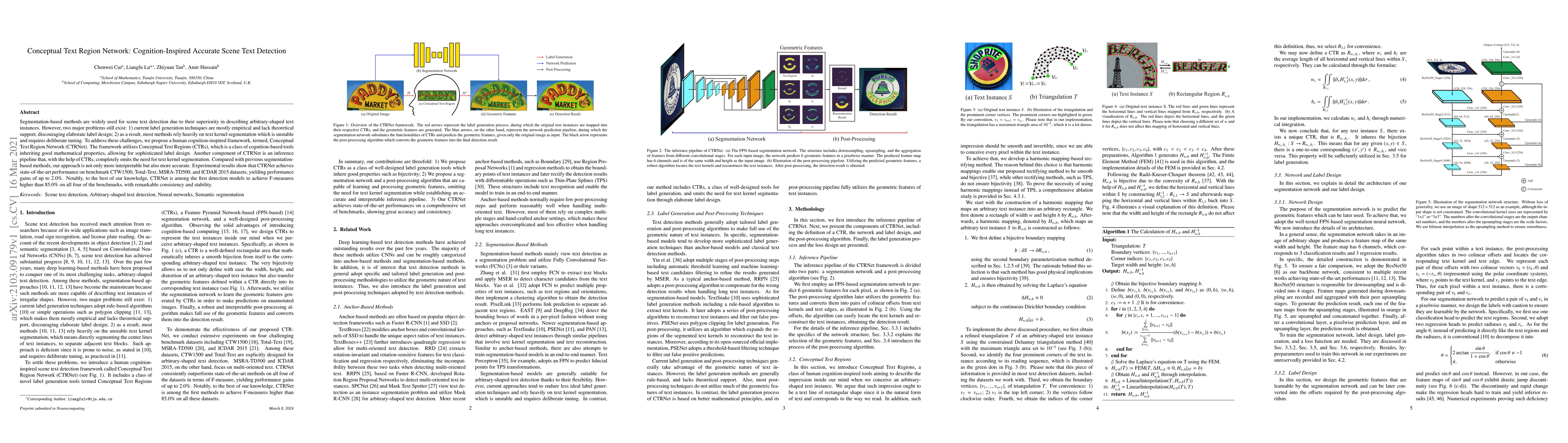 The paper proposes a Conceptual Text Region Network (CTRNet) for scene text detection, addressing the limitations of current segmentation-based methods by using cognition-inspired Conceptual Text Regions (CTRs) for more interpretable and accurate detection. CTRNet achieves state-of-the-art performance on multiple benchmarks, demonstrating significant improvements in accuracy and consistency.