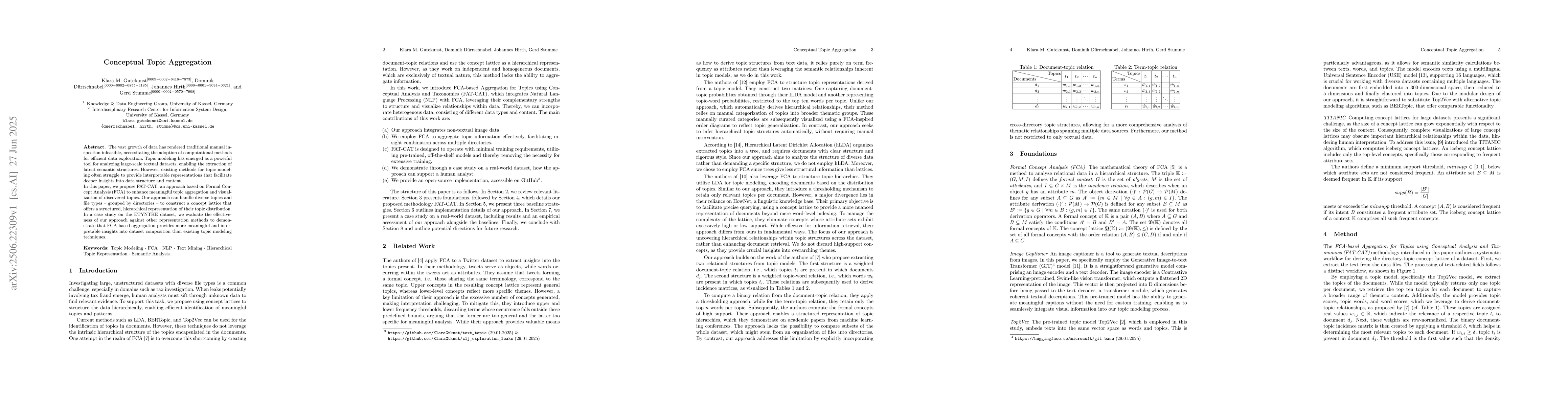 The vast growth of data has rendered traditional manual inspection infeasible, necessitating the adoption of computational methods for efficient data exploration. Topic modeling has emerged as a powerful tool for analyzing large-scale textual datasets, enabling the extraction of latent semantic structures. However, existing methods for topic modeling often struggle to provide interpretable representations that facilitate deeper insights into data structure and content. In this paper, we propose FAT-CAT, an approach based on Formal Concept Analysis (FCA) to enhance meaningful topic aggregation and visualization of discovered topics. Our approach can handle diverse topics and file types -- grouped by directories -- to construct a concept lattice that offers a structured, hierarchical representation of their topic distribution. In a case study on the ETYNTKE dataset, we evaluate the effectiveness of our approach against other representation methods to demonstrate that FCA-based aggregation provides more meaningful and interpretable insights into dataset composition than existing topic modeling techniques.