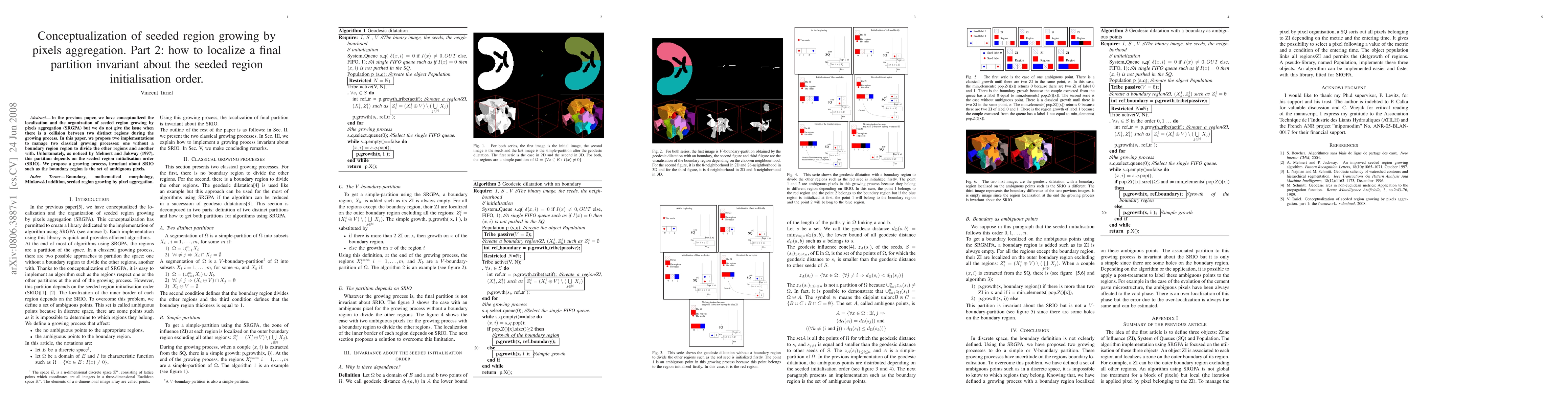 In the previous paper, we have conceptualized the localization and the organization of seeded region growing by pixels aggregation (SRGPA) but we do not give the issue when there is a collision between two distinct regions during the growing process. In this paper, we propose two implementations to manage two classical growing processes: one without a boundary region region to divide the other regions and another with. Unfortunately, as noticed by Mehnert and Jakway (1997), this partition depends on the seeded region initialisation order (SRIO). We propose a growing process, invariant about SRIO such as the boundary region is the set of ambiguous pixels.