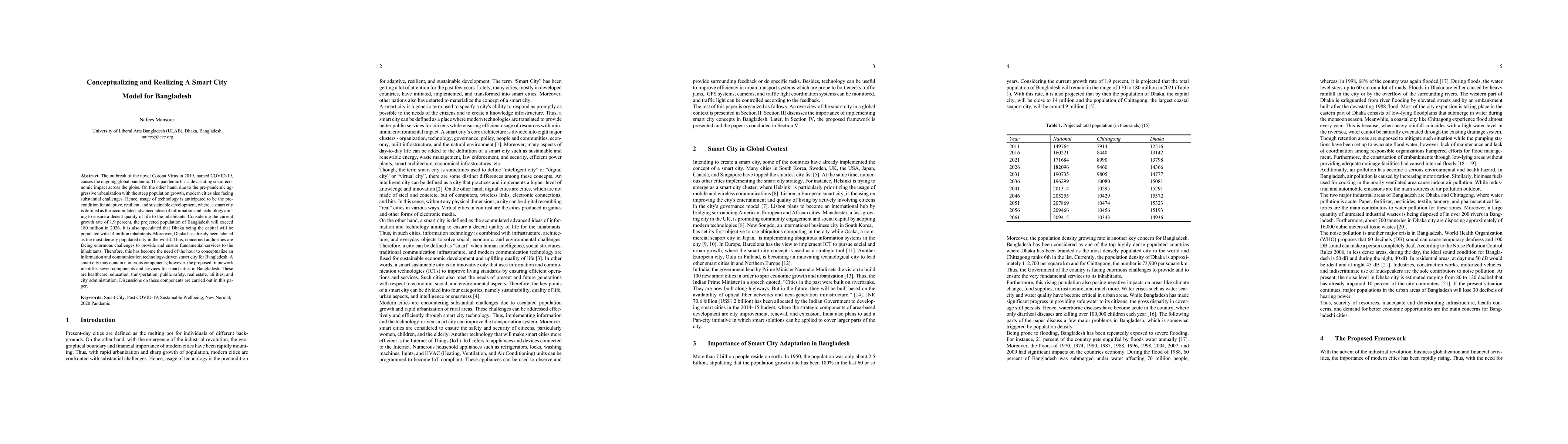 The outbreak of the novel Corona Virus in 2019, named COVID-19, causes the ongoing global pandemic. This pandemic has a devastating socio-economic impact across the globe. On the other hand, due to the pre-pandemic aggressive urbanization with the steep population growth, modern cities also facing substantial challenges. Hence, usage of technology is anticipated to be the precondition for adaptive, resilient, and sustainable development, where, a smart city is defined as the accumulated advanced ideas of information and technology aiming to ensure a decent quality of life for the inhabitants. Considering the current growth rate of 1.9 percent, the projected population of Bangladesh will exceed 180 million in 2026. It is also speculated that Dhaka being the capital will be populated with 14 million inhabitants. Moreover, Dhaka has already been labeled as the most densely populated city in the world. Thus, concerned authorities are facing enormous challenges to provide and ensure fundamental services to the in-habitants. Therefore, this has become the need of the hour to conceptualize an information and communication technology-driven smart city for Bangladesh. A smart city may contain numerous components; however, the proposed framework identifies seven components and services for smart cities in Bangladesh. These are healthcare, education, transportation, public safety, real estate, utilities, and city administration. Discussions on these components are carried out in this paper.