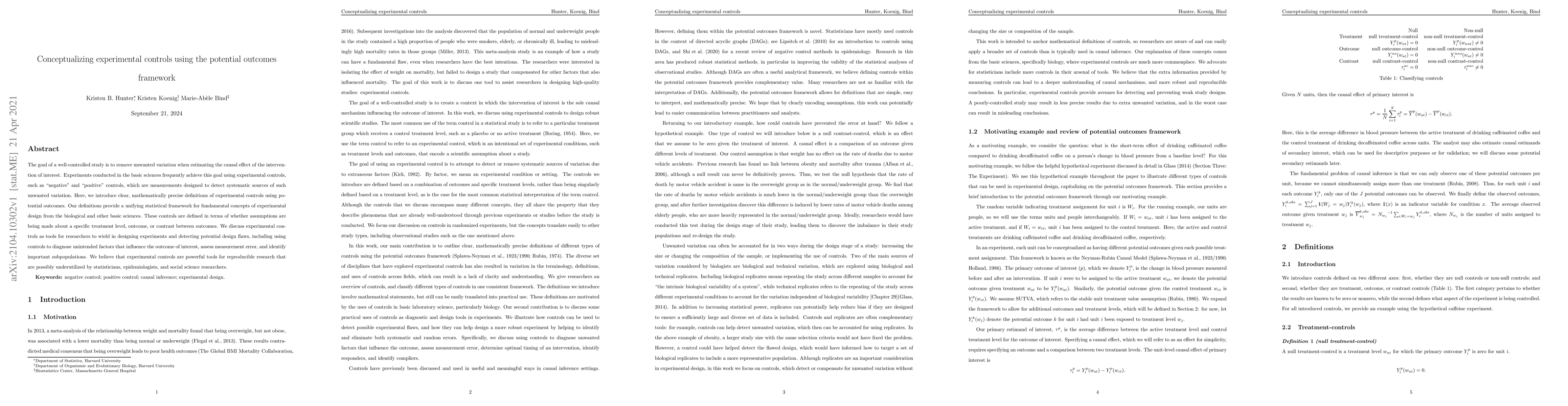 This paper introduces mathematically precise definitions of experimental controls using the potential outcomes framework, providing a unifying statistical approach for fundamental experimental design concepts across the basic sciences. It emphasizes the role of controls in detecting design flaws, assessing measurement error, and identifying influential subpopulations, advocating for their broader use in reproducible research.
