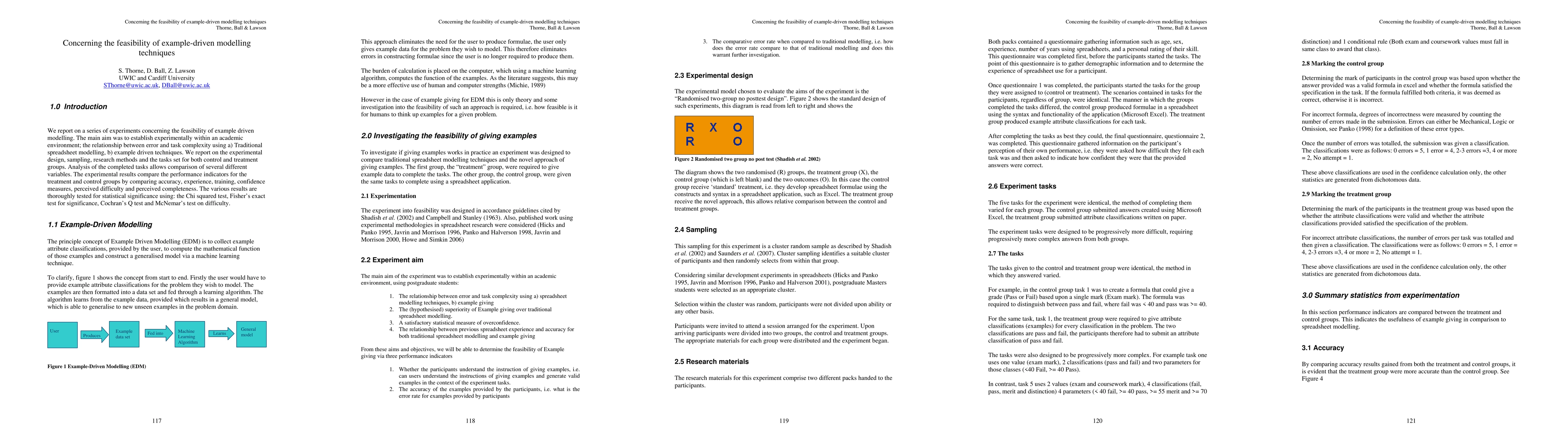 This study experimentally evaluates the feasibility of example-driven modelling techniques against traditional spreadsheet modelling, focusing on the relationship between error and task complexity. Results compare performance indicators like accuracy, experience, and perceived difficulty between control and treatment groups, using statistical tests for significance.