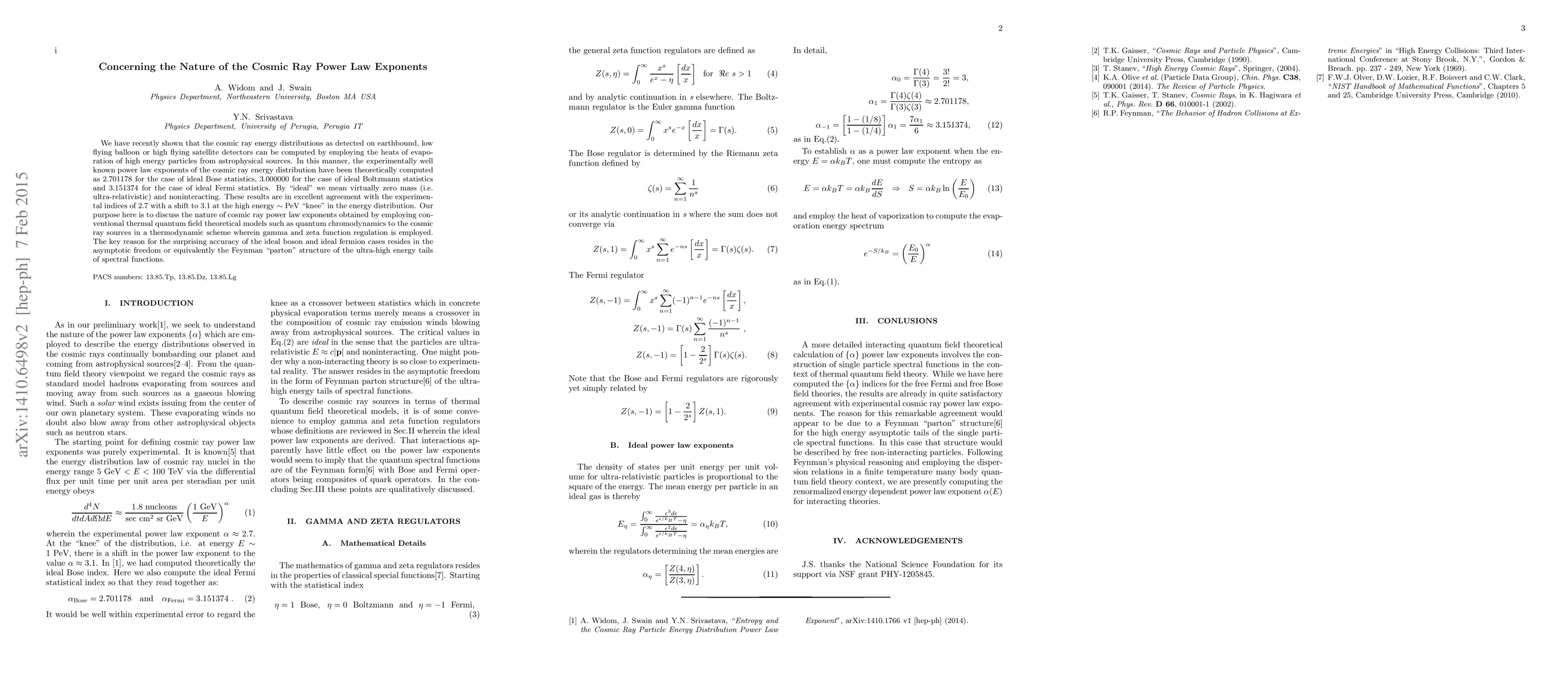 We have recently shown that the cosmic ray energy distributions as detected on earthbound, low flying balloon or high flying satellite detectors can be computed by employing the heats of evaporation of high energy particles from astrophysical sources. In this manner, the experimentally well known power law exponents of the cosmic ray energy distribution have been theoretically computed as 2.701178 for the case of ideal Bose statistics, 3.000000 for the case of ideal Boltzmann statistics and 3.151374 for the case of ideal Fermi statistics. By "ideal" we mean virtually zero mass (i.e. ultra-relativistic) and noninteracting. These results are in excellent agreement with the experimental indices of 2.7 with a shift to 3.1 at the high energy ~ PeV "knee" in the energy distribution. Our purpose here is to discuss the nature of cosmic ray power law exponents obtained by employing conventional thermal quantum field theoretical models such as quantum chromodynamics to the cosmic ray sources in a thermodynamic scheme wherein gamma and zeta function regulation is employed. The key reason for the surprising accuracy of the ideal boson and ideal fermion cases resides in the asymptotic freedom or equivalently the Feynman "parton" structure of the ultra-high energy tails of spectral functions.
