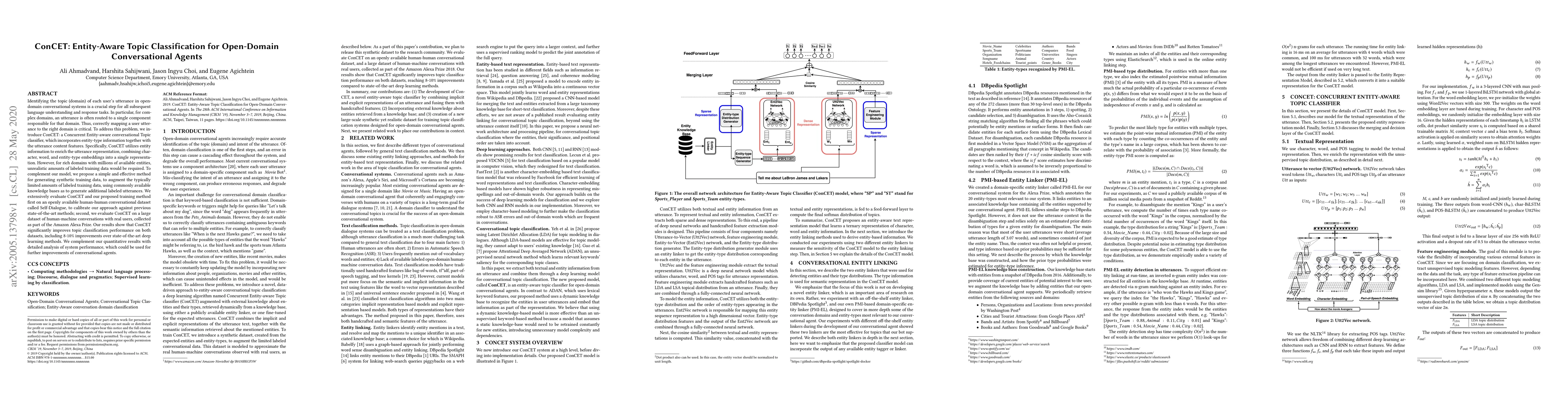 ConCET is an entity-aware topic classifier for open-domain conversational agents that combines utterance content with entity-type information to enhance topic classification. The model also employs synthetic training data generation to augment limited labeled data, achieving significant improvements over state-of-the-art methods on both human-human and human-machine conversational datasets.