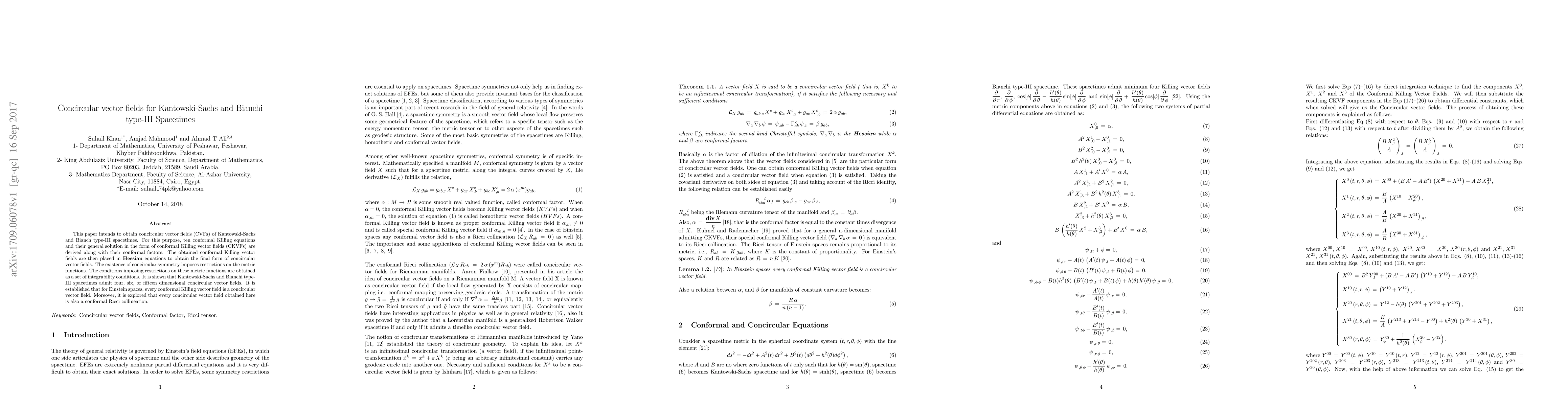This paper derives concircular vector fields for Kantowski-Sachs and Bianchi type III spacetimes, revealing that these spacetimes can have four, six, or fifteen-dimensional concircular symmetries. It establishes that for Einstein spaces, every conformal Killing vector field is also a concircular vector field and confirms that all derived concircular vector fields are conformal Ricci collineations.