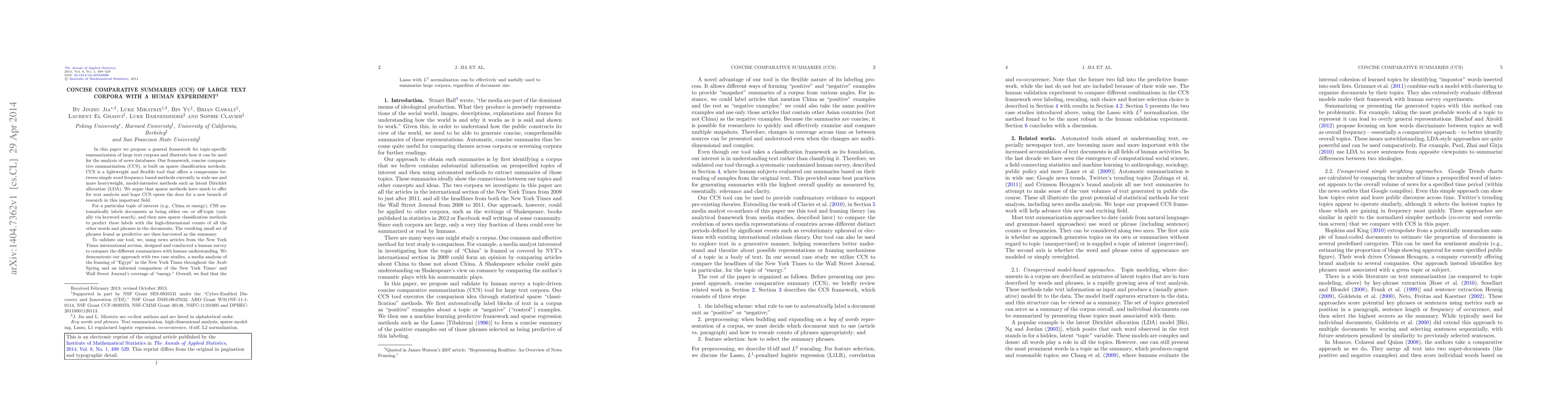 The paper proposes a framework called Concise Comparative Summaries (CCS) for topic-specific summarization of large text corpora using sparse classification methods. CCS is demonstrated through news database analysis, comparing Lasso with L2 normalization as an effective summarization tool.
