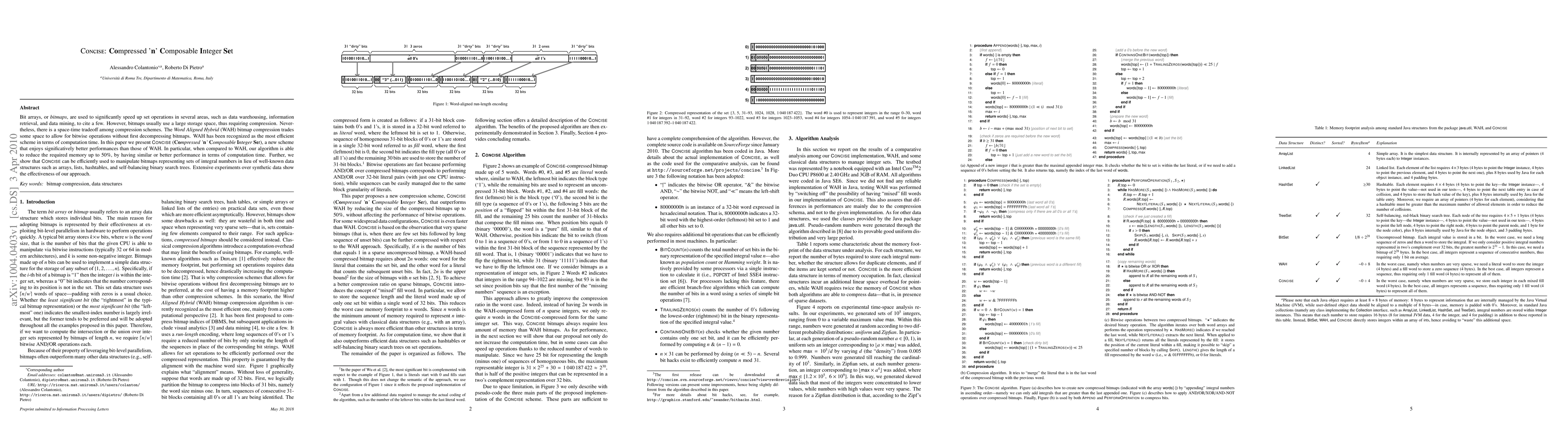 Bit arrays, or bitmaps, are used to significantly speed up set operations in several areas, such as data warehousing, information retrieval, and data mining, to cite a few. However, bitmaps usually use a large storage space, thus requiring compression. Nevertheless, there is a space-time tradeoff among compression schemes. The Word Aligned Hybrid (WAH) bitmap compression trades some space to allow for bitwise operations without first decompressing bitmaps. WAH has been recognized as the most efficient scheme in terms of computation time. In this paper we present CONCISE (Compressed 'n' Composable Integer Set), a new scheme that enjoys significatively better performances than those of WAH. In particular, when compared to WAH, our algorithm is able to reduce the required memory up to 50%, by having similar or better performance in terms of computation time. Further, we show that CONCISE can be efficiently used to manipulate bitmaps representing sets of integral numbers in lieu of well-known data structures such as arrays, lists, hashtables, and self-balancing binary search trees. Extensive experiments over synthetic data show the effectiveness of our approach.