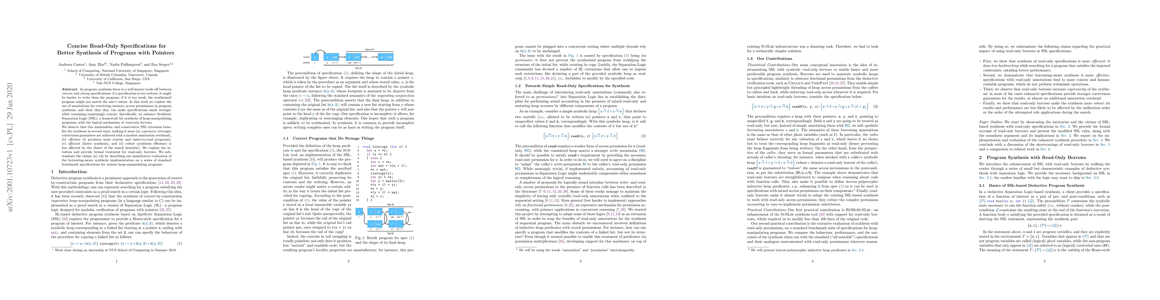 This paper proposes read-only specifications to enhance Synthetic Separation Logic for synthesizing programs with pointers, achieving stronger correctness guarantees while maintaining conciseness. The proposed read-only borrows improve expressiveness, effectiveness, efficiency, and robustness of the synthesis process, as demonstrated through quantitative evaluations on benchmark programs.