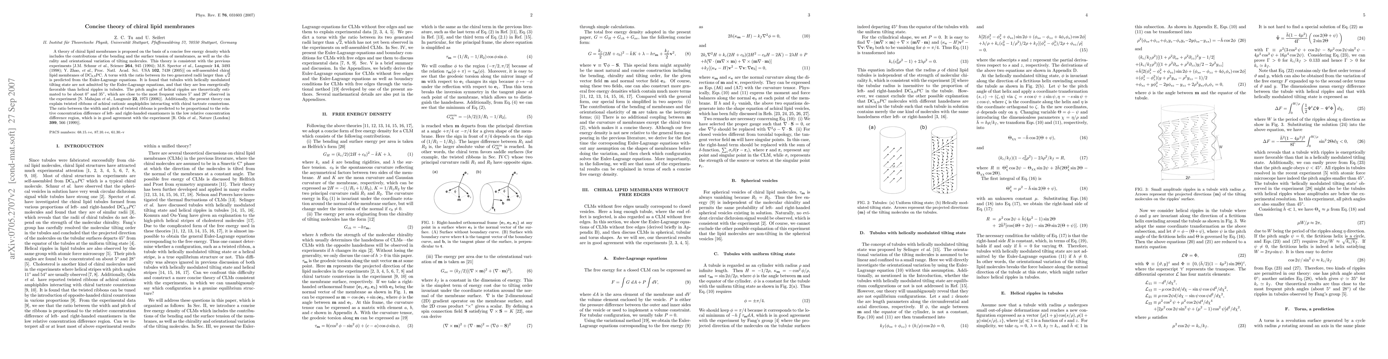 This paper proposes a concise theory for chiral lipid membranes based on a free energy density model, aligning with experimental observations on DC$_{8,9}$PC. It predicts helical ripples in tubules and twisted ribbons, showing good agreement with experimental data on pitch angles and ribbon structures.