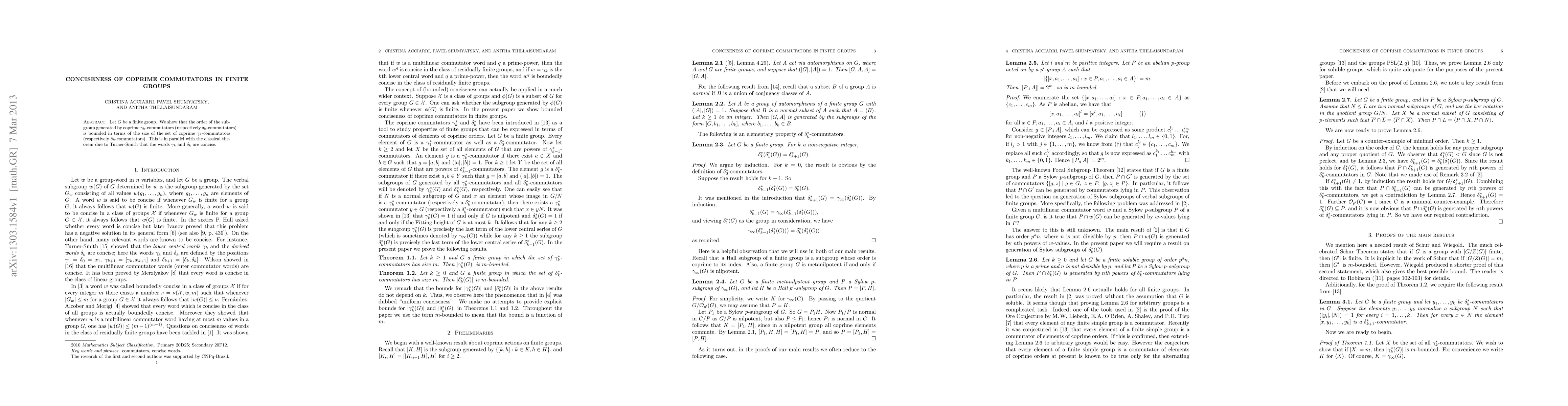 Let $G$ be a finite group. We show that the order of the subgroup generated by coprime $\gamma_k$-commutators (respectively $\delta_k$-commutators) is bounded in terms of the size of the set of coprime $\gamma_k$-commutators (respectively $\delta_k$-commutators). This is in parallel with the classical theorem due to Turner-Smith that the words $\gamma_k$ and $\delta_k$ are concise.