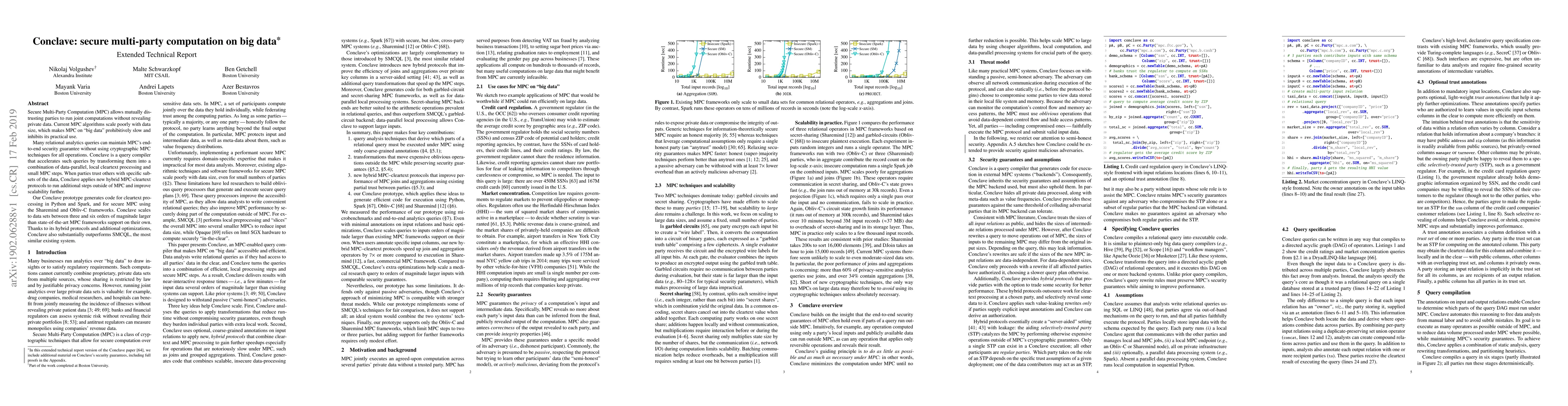 Conclave introduces a query compiler that accelerates secure multi-party computation on big data by combining data-parallel cleartext processing with small MPC steps, significantly improving scalability and performance over existing MPC frameworks. The hybrid MPC-cleartext protocols enable further optimization when parties trust subsets of the data.