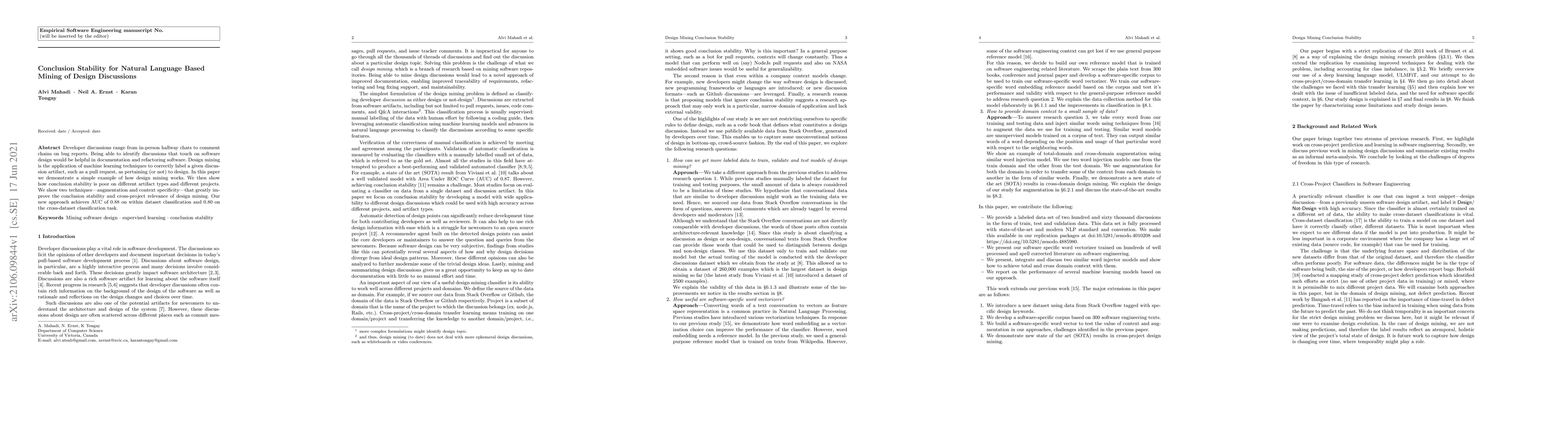 Developer discussions range from in-person hallway chats to comment chains on bug reports. Being able to identify discussions that touch on software design would be helpful in documentation and refactoring software. Design mining is the application of machine learning techniques to correctly label a given discussion artifact, such as a pull request, as pertaining (or not) to design. In this paper we demonstrate a simple example of how design mining works. We then show how conclusion stability is poor on different artifact types and different projects. We show two techniques -- augmentation and context specificity -- that greatly improve the conclusion stability and cross-project relevance of design mining. Our new approach achieves AUC of 0.88 on within dataset classification and 0.80 on the cross-dataset classification task.