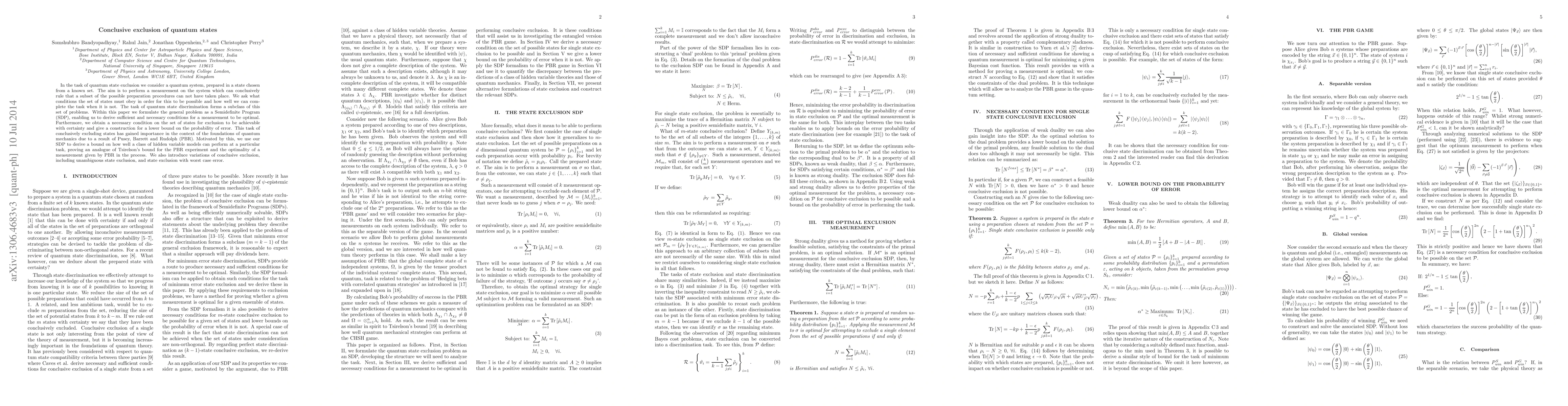 This paper presents a method to conclusively exclude certain quantum states using a Semidefinite Program (SDP). It derives conditions for optimal measurements and state sets, proving a bound analogous to Tsirelson's bound for the PBR experiment. The research also explores variations like unambiguous state exclusion and state exclusion with worst case error.