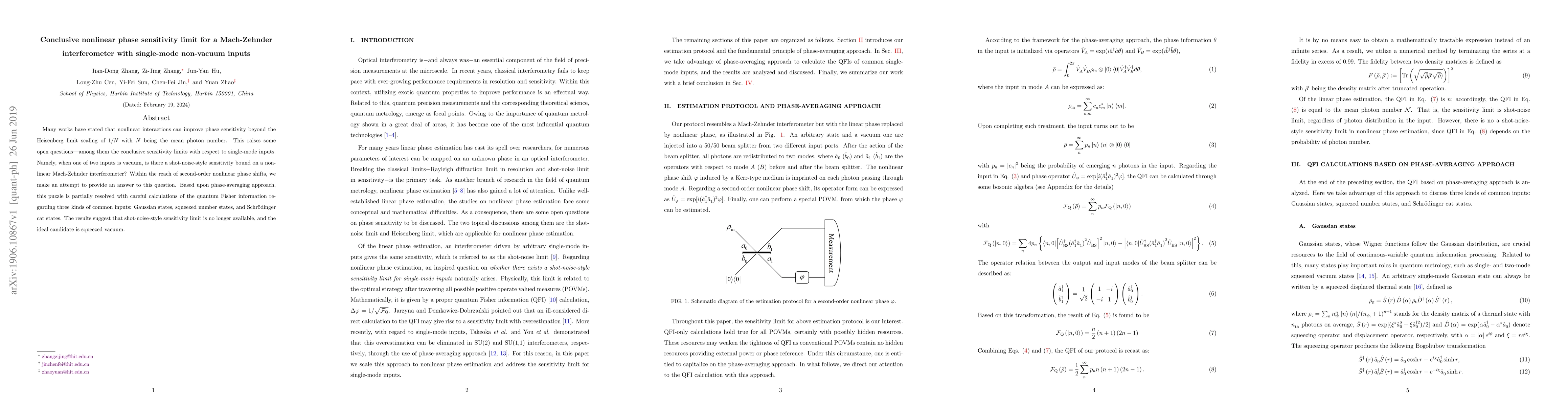 This paper investigates the phase sensitivity limits of a nonlinear Mach-Zehnder interferometer with single-mode non-vacuum inputs, finding that shot-noise-style sensitivity bounds do not apply. It concludes that squeezed vacuum is the ideal candidate for achieving optimal phase sensitivity.