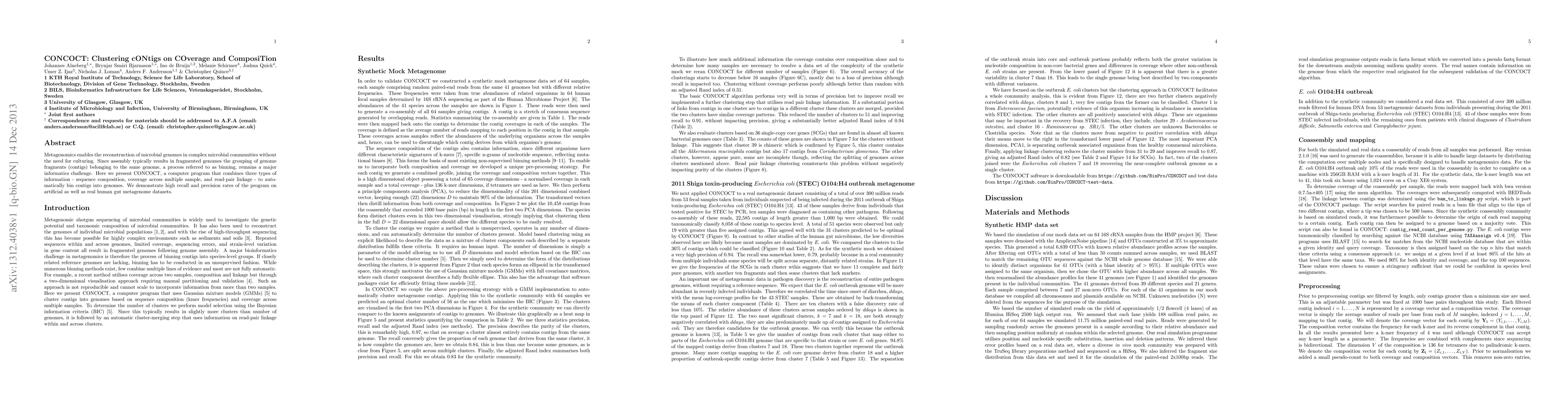 Metagenomics enables the reconstruction of microbial genomes in complex microbial communities without the need for culturing. Since assembly typically results in fragmented genomes the grouping of genome fragments (contigs) belonging to the same genome, a process referred to as binning, remains a major informatics challenge. Here we present CONCOCT, a computer program that combines three types of information - sequence composition, coverage across multiple sample, and read-pair linkage - to automatically bin contigs into genomes. We demonstrate high recall and precision rates of the program on artificial as well as real human gut metagenome datasets.