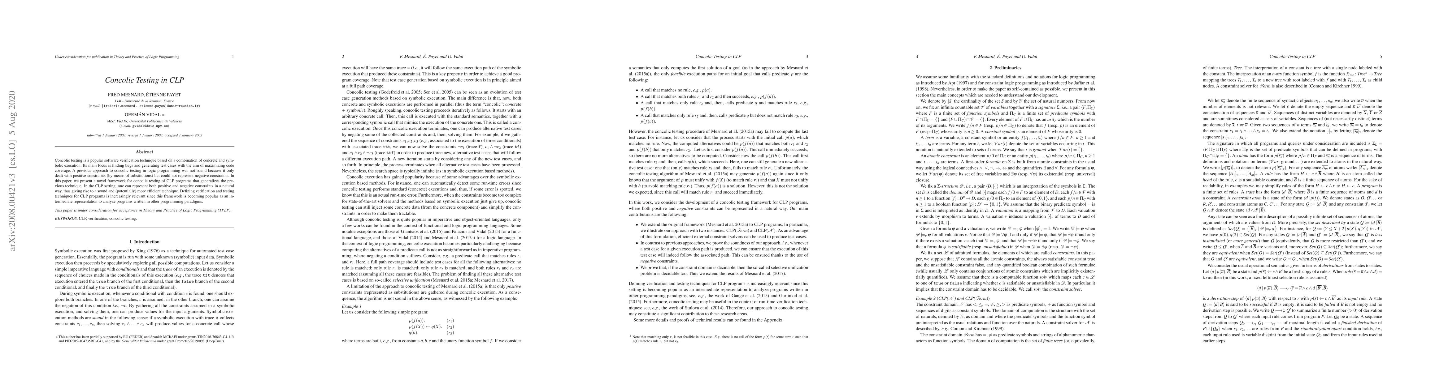 This paper introduces a novel framework for concolic testing of CLP programs, addressing previous limitations by representing both positive and negative constraints, thus ensuring soundness and potentially higher efficiency. This advancement is crucial as CLP frameworks are increasingly used as intermediate representations in program analysis.