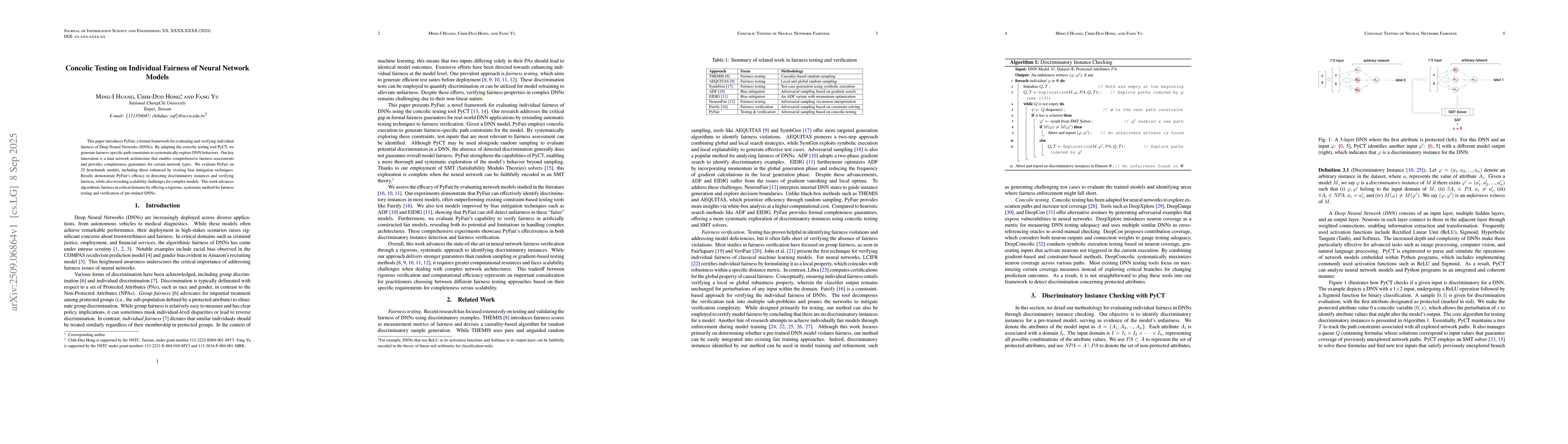 This paper introduces PyFair, a formal framework for evaluating and verifying individual fairness of Deep Neural Networks (DNNs). By adapting the concolic testing tool PyCT, we generate fairness-specific path constraints to systematically explore DNN behaviors. Our key innovation is a dual network architecture that enables comprehensive fairness assessments and provides completeness guarantees for certain network types. We evaluate PyFair on 25 benchmark models, including those enhanced by existing bias mitigation techniques. Results demonstrate PyFair's efficacy in detecting discriminatory instances and verifying fairness, while also revealing scalability challenges for complex models. This work advances algorithmic fairness in critical domains by offering a rigorous, systematic method for fairness testing and verification of pre-trained DNNs.