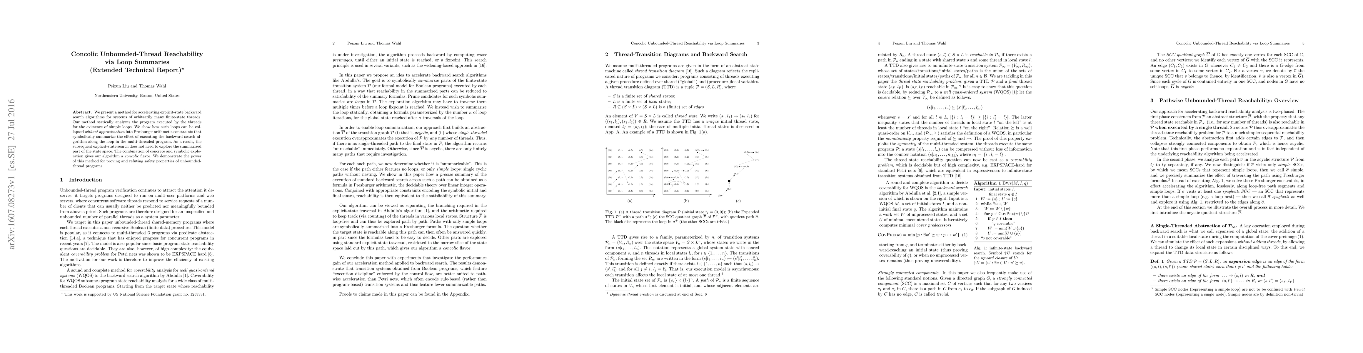 We present a method for accelerating explicit-state backward search algorithms for systems of arbitrarily many finite-state threads. Our method statically analyzes the program executed by the threads for the existence of simple loops. We show how such loops can be collapsed without approximation into Presburger arithmetic constraints that symbolically summarize the effect of executing the backward search algorithm along the loop in the multi-threaded program. As a result, the subsequent explicit-state search does not need to explore the summarized part of the state space. The combination of concrete and symbolic exploration gives our algorithm a concolic flavor. We demonstrate the power of this method for proving and refuting safety properties of unbounded-thread programs.