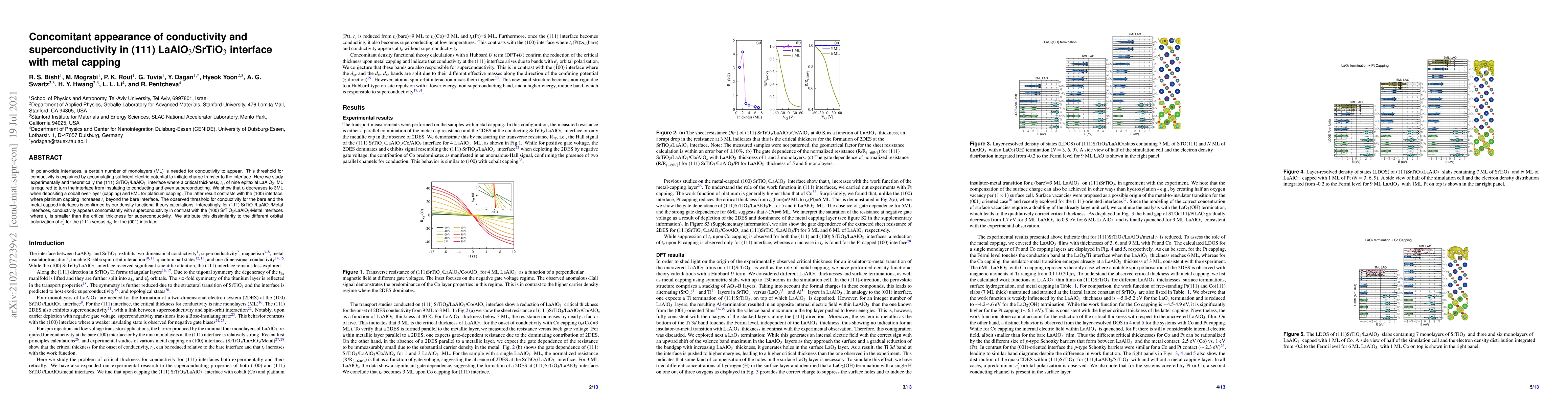 This study investigates the (111) SrTiO3/LaAlO3 interface, showing that a critical thickness of nine monolayers is necessary for conductivity and superconductivity. The addition of a metal capping layer reduces this threshold significantly, with cobalt and platinum exhibiting different effects. Notably, for the (111) interface, conductivity and superconductivity emerge simultaneously, unlike the (100) interface, attributed to differences in orbital polarization.