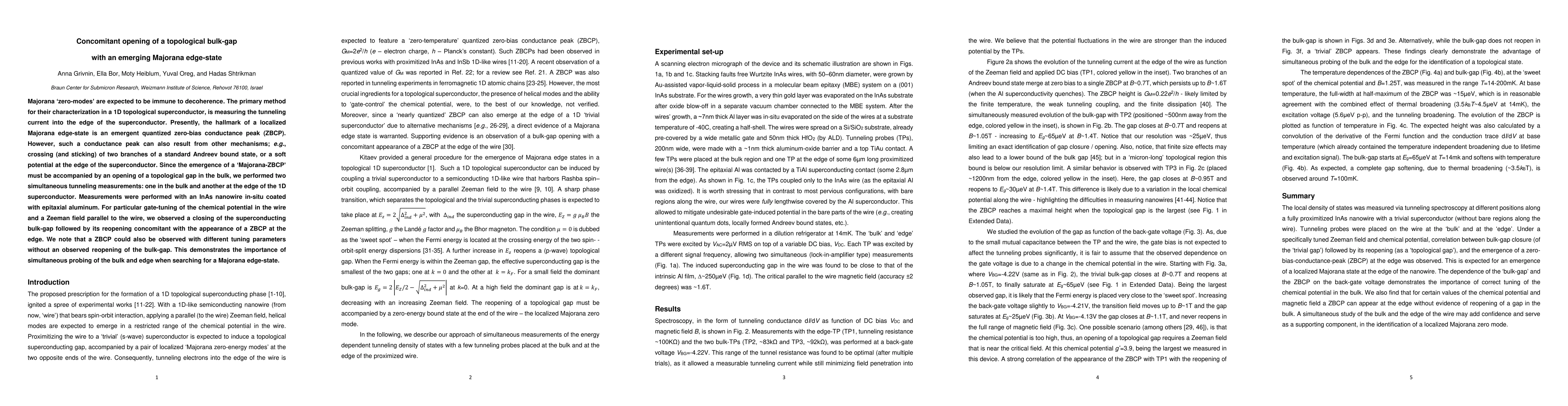 Majorana 'zero-modes' are expected to be immune to decoherence. The primary method for their characterization in a 1D topological superconductor, is measuring the tunneling current into the edge of the superconductor. Presently, the hallmark of a localized Majorana edge-state is an emergent quantized zero-bias conductance peak (ZBCP). However, such a conductance peak can also result from other mechanisms; e.g., crossing (and sticking) of two branches of a standard Andreev bound state, or a soft potential at the edge of the superconductor. Since the emergence of a 'Majorana-ZBCP' must be accompanied by an opening of a topological gap in the bulk, we performed two simultaneous tunneling measurements: one in the bulk and another at the edge of the 1D superconductor. Measurements were performed with an InAs nanowire in-situ coated with epitaxial aluminum. For particular gate-tuning of the chemical potential in the wire and a Zeeman field parallel to the wire, we observed a closing of the superconducting bulk-gap followed by its reopening concomitant with the appearance of a ZBCP at the edge. We note that a ZBCP could also be observed with different tuning parameters without an observed reopening of the bulk-gap. This demonstrates the importance of simultaneous probing of the bulk and edge when searching for a Majorana edge-state.