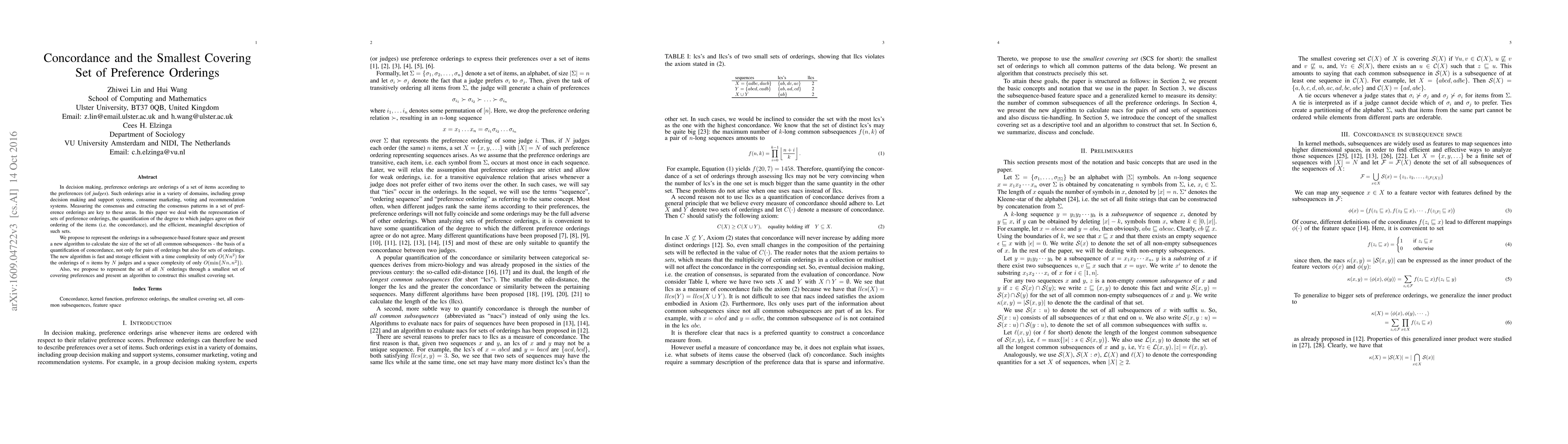 This paper proposes a subsequence-based feature space to represent sets of preference orderings and introduces an efficient algorithm to quantify concordance among judges. It also presents a method for constructing the smallest covering set of preference orderings, with algorithms that have a time complexity of $O(Nn^2)$ and space complexity of $O(\min\{Nn,n^2\})$. Source code is available on GitHub.