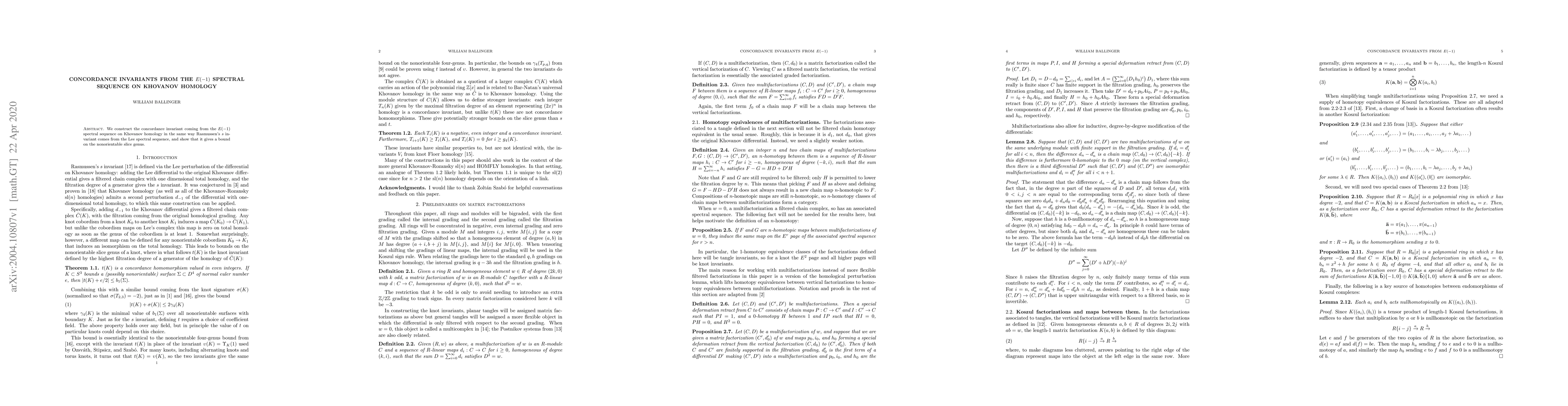 Summary: This paper constructs a concordance invariant derived from the $E(-1)$ spectral sequence on Khovanov homology, analogous to Rasmussen's $s$ invariant from the Lee spectral sequence, and demonstrates that it provides a bound on the nonorientable slice genus.