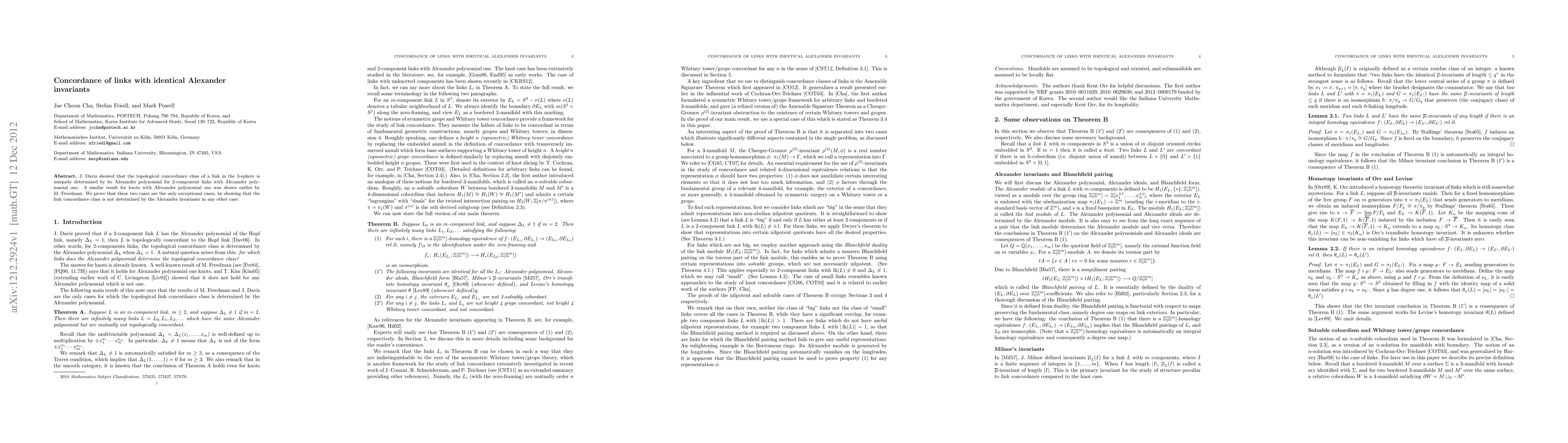 Summary: Davis proved that links with Alexander polynomial one determine their concordance class in the 3-sphere. This paper establishes that this unique determination by Alexander invariants only holds for 2-component links and knots with Alexander polynomial one, and not for other cases.