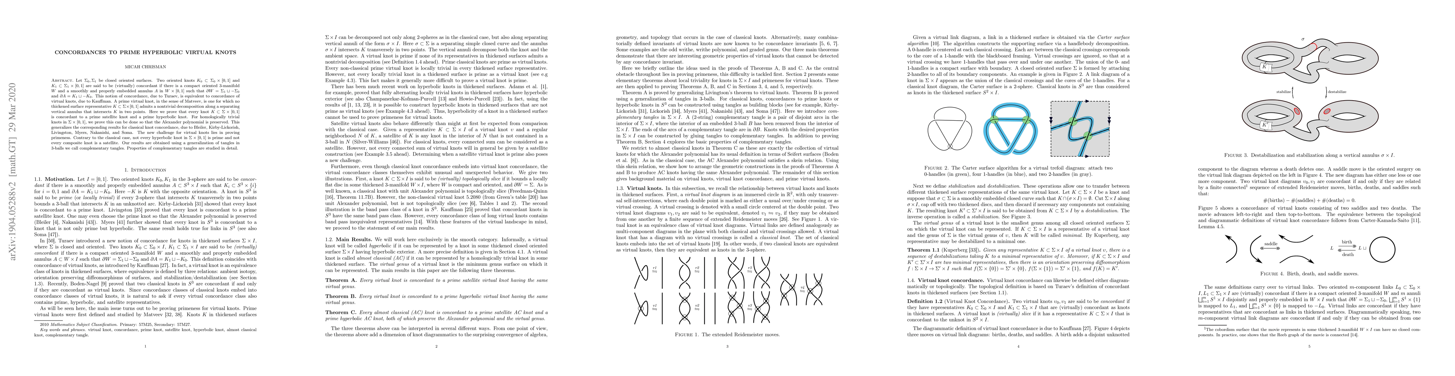 Let $\Sigma_0,\Sigma_1$ be closed oriented surfaces. Two oriented knots $K_0 \subset \Sigma_0 \times [0,1]$ and $K_1 \subset \Sigma_1 \times [0,1]$ are said to be (virtually) concordant if there is a compact oriented $3$-manifold $W$ and a smoothly and properly embedded annulus $A$ in $W \times [0,1]$ such that $\partial W=\Sigma_1 \sqcup -\Sigma_0$ and $\partial A=K_1 \sqcup -K_0$. This notion of concordance, due to Turaev, is equivalent to concordance of virtual knots, due to Kauffman. A prime virtual knot, in the sense of Matveev, is one for which no thickened surface representative $K \subset \Sigma \times [0,1]$ admits a nontrivial decomposition along a separating vertical annulus that intersects $K$ in two points. Here we prove that every knot $K \subset \Sigma \times [0,1]$ is concordant to a prime satellite knot and a prime hyperbolic knot. For homologically trivial knots in $\Sigma \times [0,1]$, we prove this can be done so that the Alexander polynomial is preserved. This generalizes the corresponding results for classical knot concordance, due to Bleiler, Kirby-Lickorish, Livingston, Myers, Nakanishi, and Soma. The new challenge for virtual knots lies in proving primeness. Contrary to the classical case, not every hyperbolic knot in $\Sigma \times [0,1]$ is prime and not every composite knot is a satellite. Our results are obtained using a generalization of tangles in $3$-balls we call complementary tangles. Properties of complementary tangles are studied in detail.