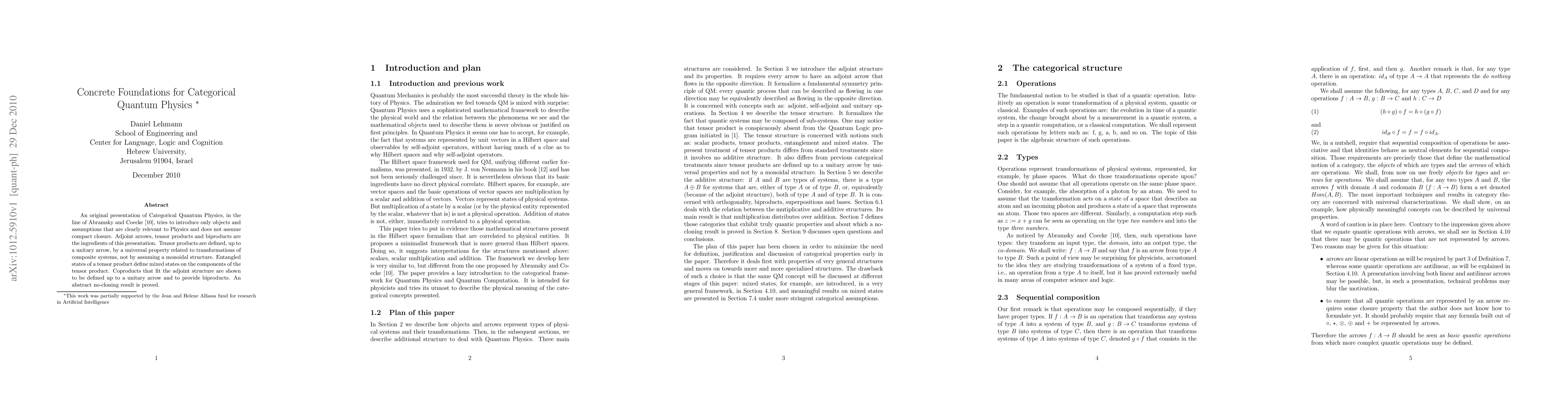 An original presentation of Categorical Quantum Physics, in the line of Abramsky and Coecke, tries to introduce only objects and assumptions that are clearly relevant to Physics and does not assume compact closure. Adjoint arrows, tensor products and biproducts are the ingredients of this presentation. Tensor products are defined, up to a unitary arrow, by a universal property related to transformations of composite systems, not by assuming a monoidal structure. Entangled states of a tensor product define mixed states on the components of the tensor product. Coproducts that fit the adjoint structure are shown to be defined up to a unitary arrow and to provide biproducts. An abstract no-cloning result is proved.