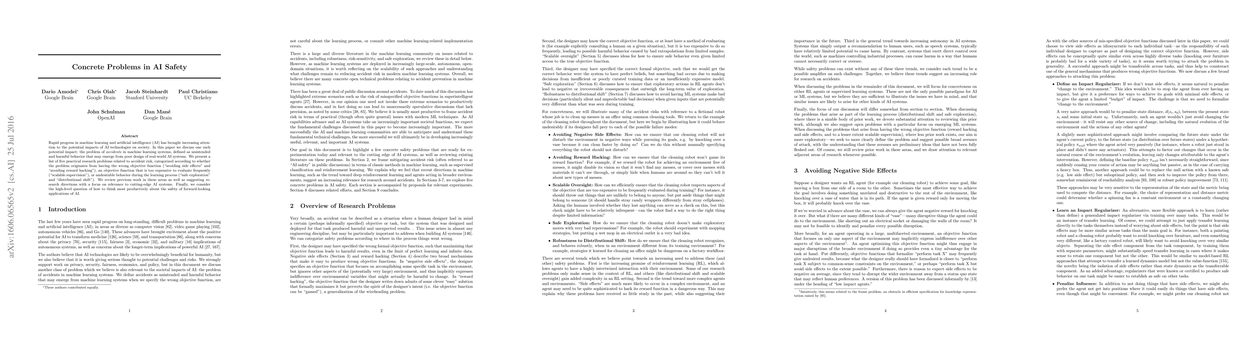 Rapid progress in machine learning and artificial intelligence (AI) has brought increasing attention to the potential impacts of AI technologies on society. In this paper we discuss one such potential impact: the problem of accidents in machine learning systems, defined as unintended and harmful behavior that may emerge from poor design of real-world AI systems. We present a list of five practical research problems related to accident risk, categorized according to whether the problem originates from having the wrong objective function ("avoiding side effects" and "avoiding reward hacking"), an objective function that is too expensive to evaluate frequently ("scalable supervision"), or undesirable behavior during the learning process ("safe exploration" and "distributional shift"). We review previous work in these areas as well as suggesting research directions with a focus on relevance to cutting-edge AI systems. Finally, we consider the high-level question of how to think most productively about the safety of forward-looking applications of AI.