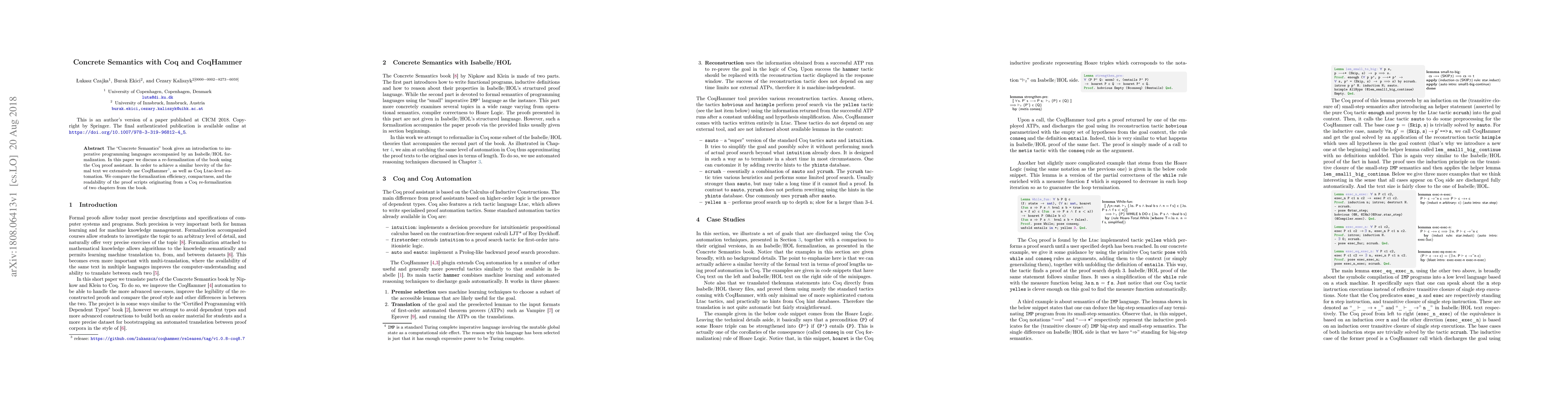 This paper re-formalizes parts of the "Concrete Semantics" book using Coq and CoqHammer, focusing on efficiency, compactness, and readability. The study compares the results of this Coq-based formalization against the original Isabelle/HOL version.