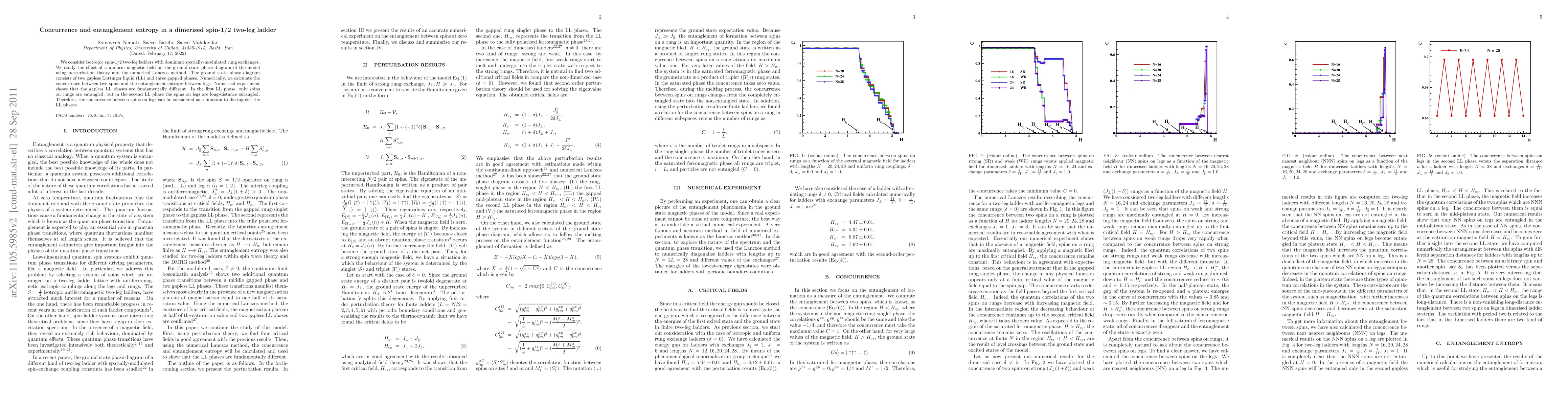 We consider the isotropic spin-1/2 two-leg ladders with the dominant spatially modulated rung exchanges. We study the effect of a uniform magnetic field on the ground state phase diagram of the model using the perturbation theory and the numerical Lanczos method. The ground state phase diagram consists of two gapless Luttinger liquid (LL) and three gapped phases. Numerically, we calculate the concurrence between two spins and entanglement entropy between legs. Numerical experiment shows that in principle the gapless LL phases are different. In the first LL phase, only spins on rungs are entangled, but in the second LL phase the spins on legs are long-distance entangled. Therefore the concurrence between spins on legs can be considered as a function to distinguish the LL phases.