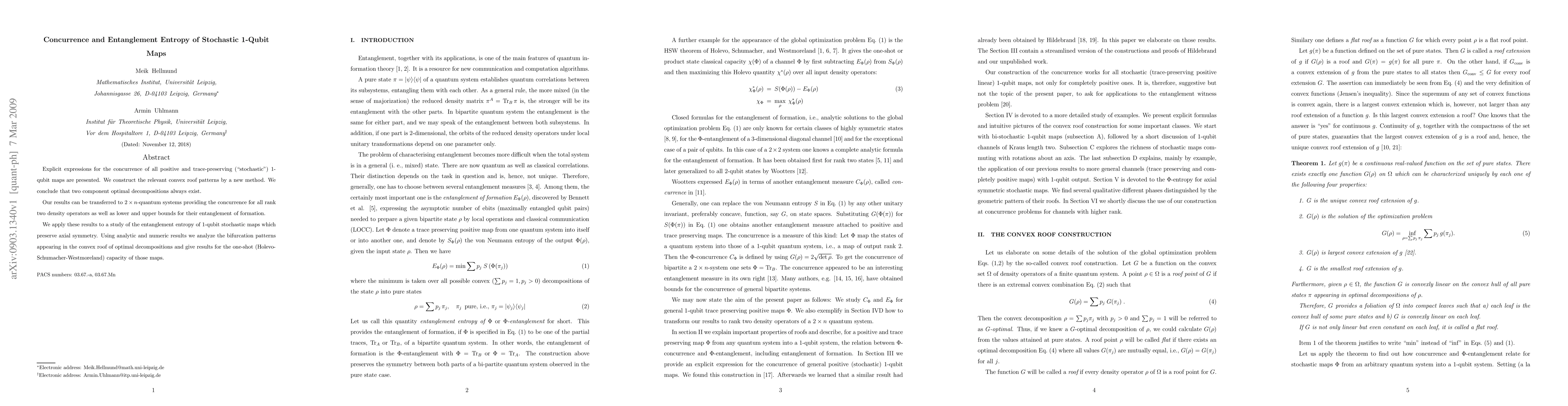 Explicit expressions for the concurrence of all positive and trace-preserving ("stochastic") 1-qubit maps are presented. We construct the relevant convex roof patterns by a new method. We conclude that two component optimal decompositions always exist. Our results can be transferred to 2xN-quantumsystems providing the concurrence for all rank two density operators as well as lower and upper bounds for their entanglement of formation. We apply these results to a study of the entanglement entropy of 1-qubit stochastic maps which preserve axial symmetry. Using analytic and numeric results we analyze the bifurcation patterns appearing in the convex roof of optimal decompositions and give results for the one-shot (Holevo-Schumacher-Westmoreland) capacity of those maps.