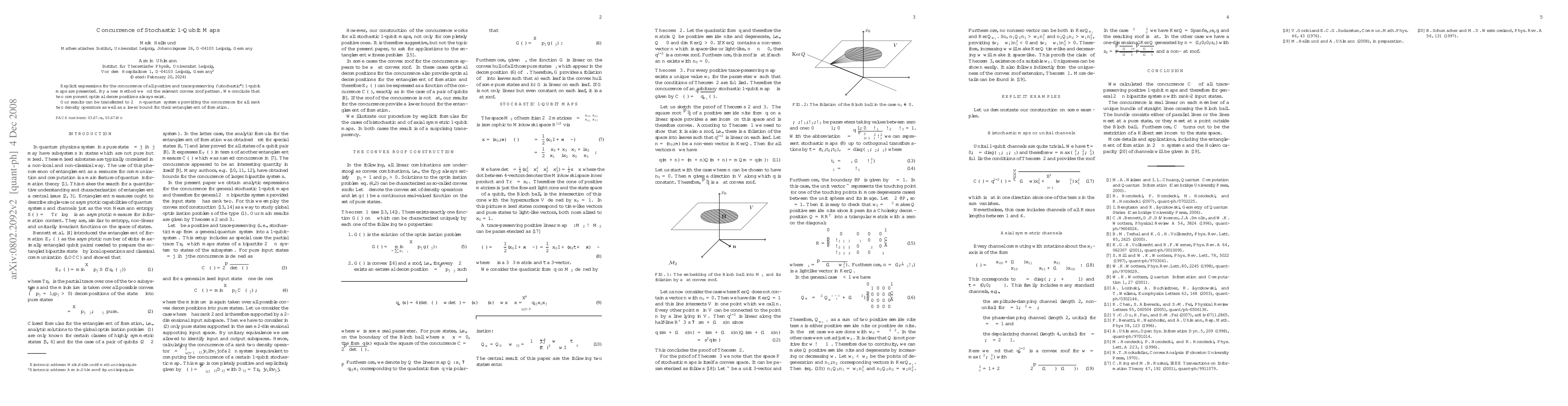 This paper presents explicit expressions for the concurrence of all 1-qubit stochastic quantum maps and identifies the relevant convex roof pattern using a new method. It concludes that optimal decompositions always exist in two components and extends these findings to $2 \times n$-quantum systems, providing concurrence for all rank two density operators and a lower bound for their entanglement of formation.