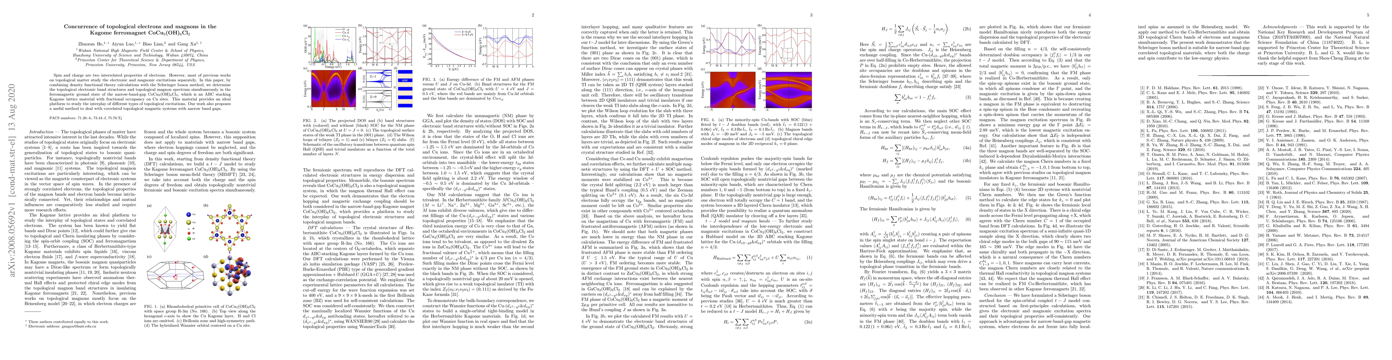 This paper combines density functional theory and the Schwinger boson method to investigate the topological electronic and magnon spectra in the Kagome ferromagnet CoCu3(OH)6Cl2, revealing the interplay between spin and charge in topological excitations and proposing a new approach for studying correlated topological magnetic systems.