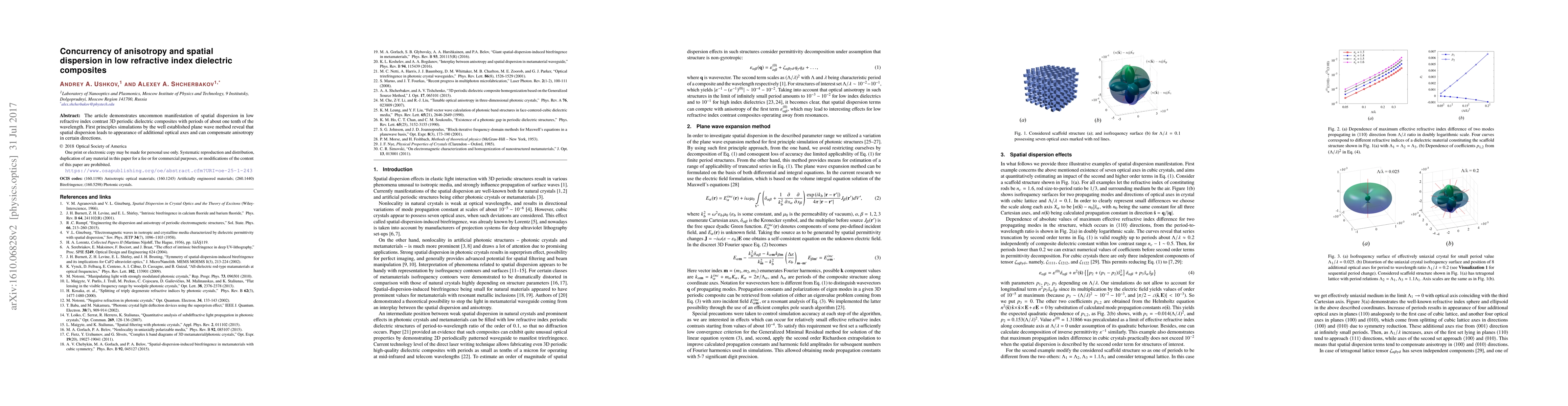 Summary: Research reveals that spatial dispersion in low refractive index dielectric composites creates additional optical axes and can counterbalance inherent anisotropy, as demonstrated by first principles simulations using the plane wave method. This unique behavior occurs in 3D periodic structures with periods near one-tenth of the wavelength.