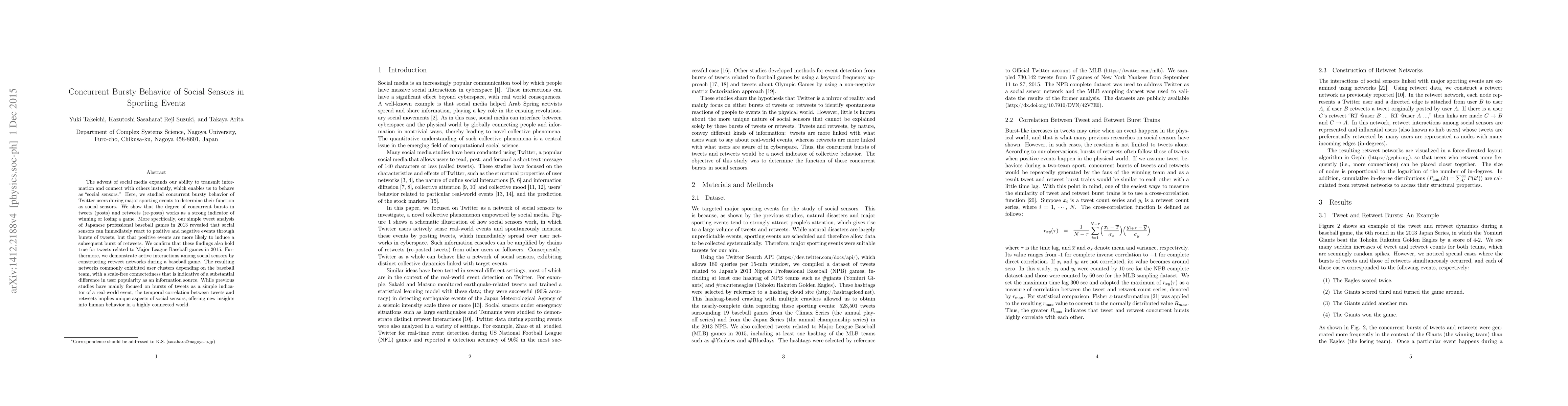The study analyzed Twitter data during major sporting events, focusing on bursty behavior of tweets and retweets as indicators of real-world events. Data was collected from Japanese professional baseball games in 2013 and Major League Baseball games in 2015, examining correlations between tweets, retweets, and game outcomes.