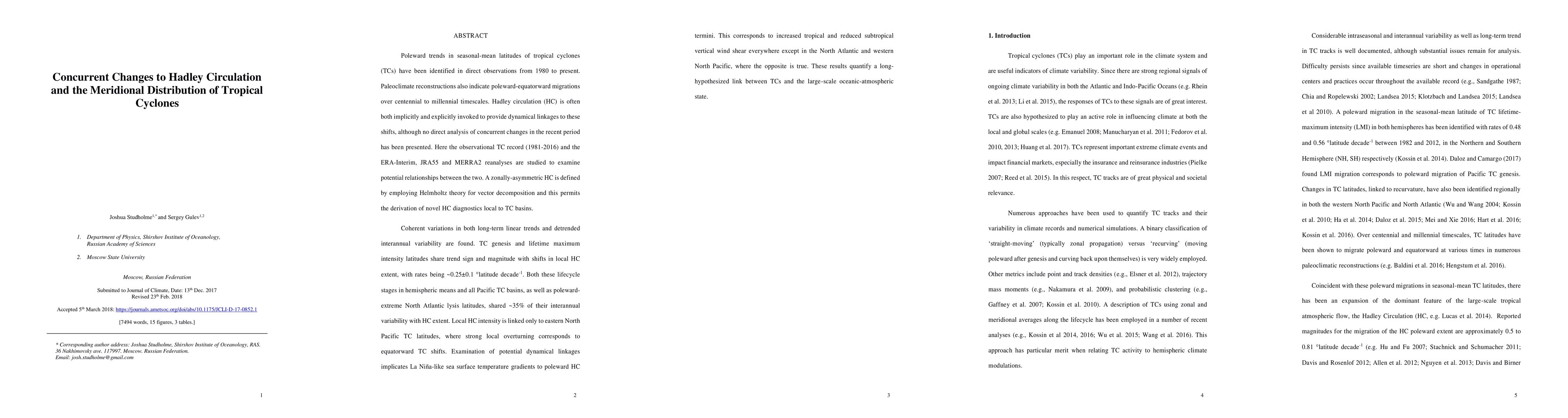 This paper investigates the concurrent changes in the Hadley circulation and the meridional distribution of tropical cyclones (TCs) from 1981 to 2016, finding coherent variations in both long-term trends and interannual variability. It reveals a significant correlation between shifts in TC genesis and maximum intensity latitudes and the local extent of the Hadley circulation, suggesting a dynamical linkage driven by La Niña-like sea surface temperature gradients.