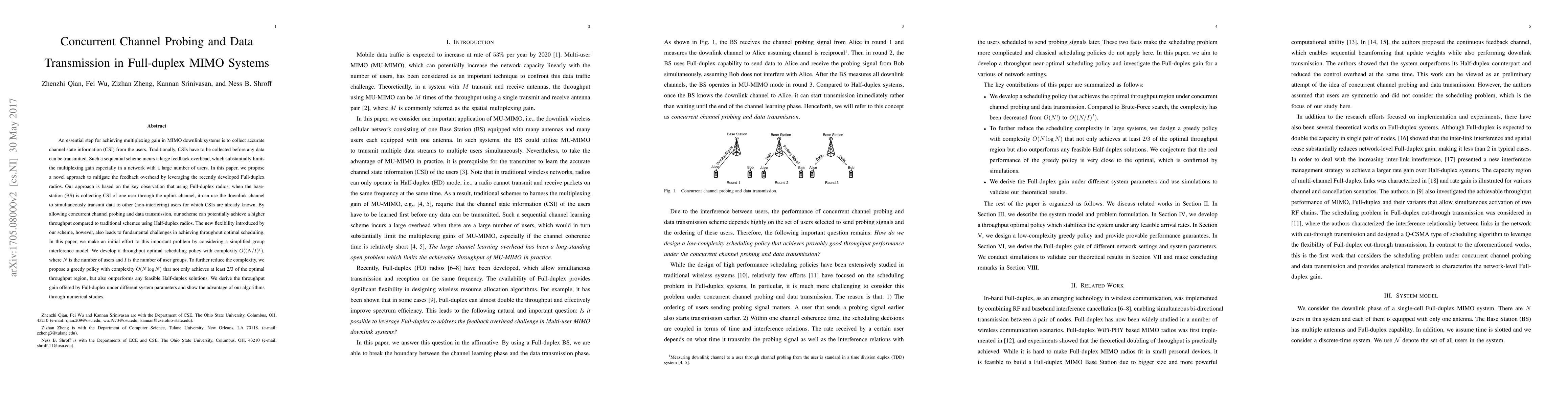 This paper proposes a novel approach to reduce feedback overhead in MIMO downlink systems by enabling concurrent channel probing and data transmission using Full-duplex radios. It develops a throughput optimal scheduling policy and a greedy policy to achieve higher throughput compared to traditional Half-duplex methods, demonstrating significant throughput gains through numerical studies.
