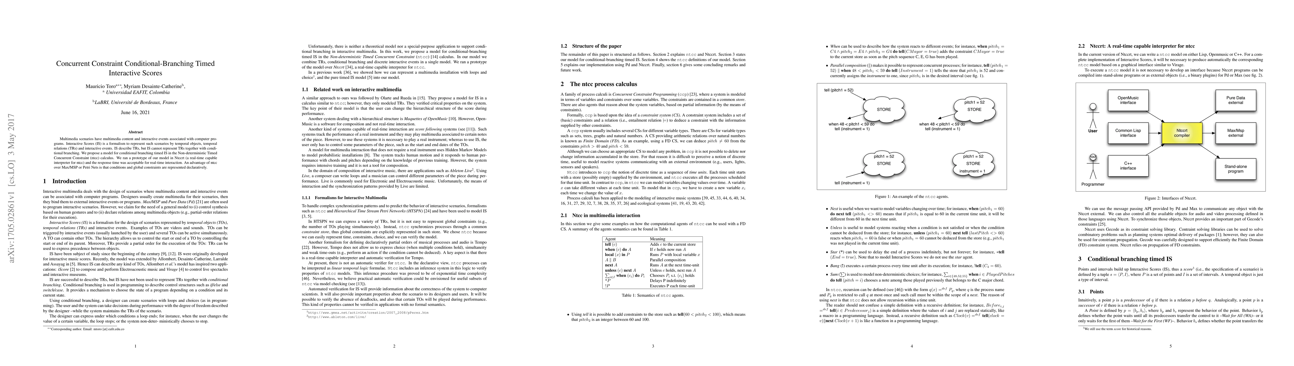 Multimedia scenarios have multimedia content and interactive events associated with computer programs. Interactive Scores (IS) is a formalism to represent such scenarios by temporal objects, temporal relations (TRs) and interactive events. IS describe TRs, but IS cannot represent TRs together with conditional branching. We propose a model for conditional branching timed IS in the Non-deterministic Timed Concurrent Constraint (ntcc) calculus. We ran a prototype of our model in Ntccrt (a real-time capable interpreter for ntcc) and the response time was acceptable for real-time interaction. An advantage of ntcc over Max/MSP or Petri Nets is that conditions and global constraints are represented declaratively.