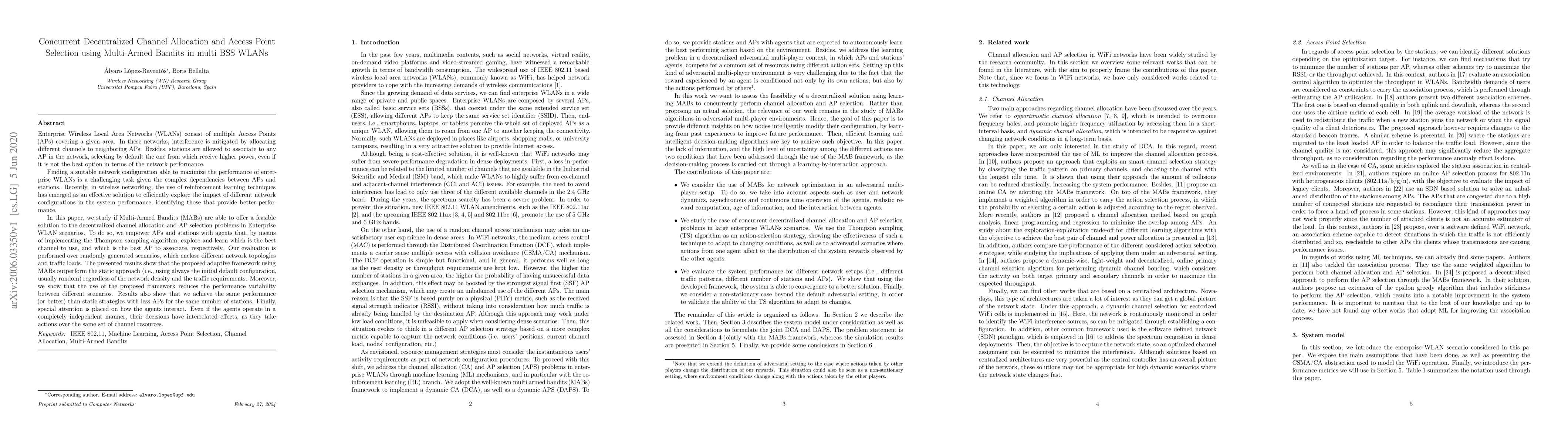This paper explores the use of Multi-Armed Bandits (MABs) to address decentralized channel allocation and Access Point selection in enterprise WLANs, employing reinforcement learning to optimize network performance. The adaptive framework using MABs outperforms static approaches, reduces performance variability, and achieves better results with fewer APs.