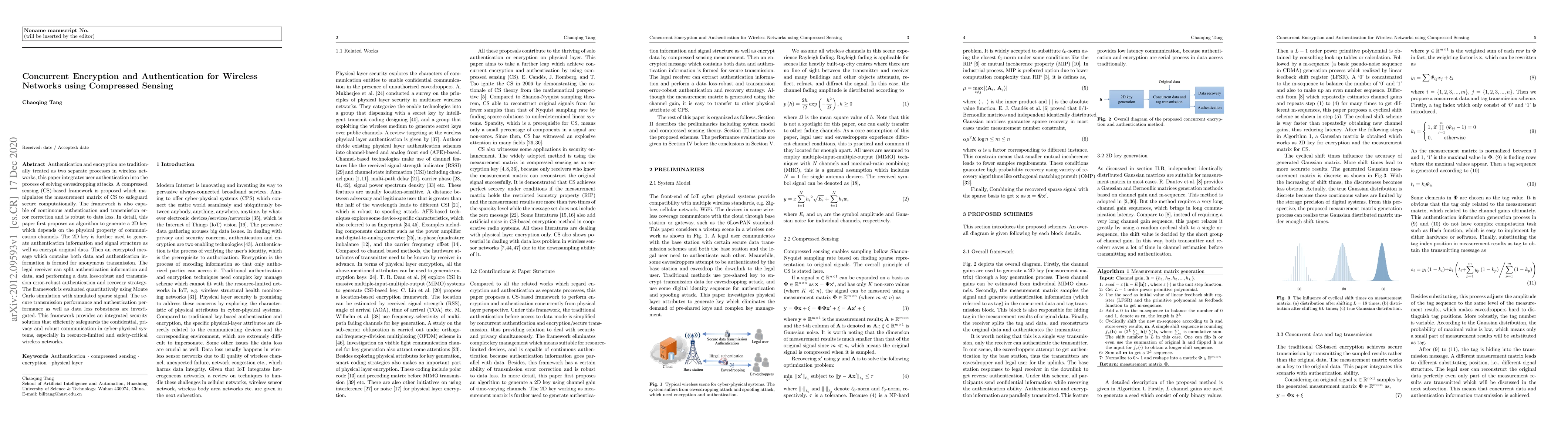 This paper proposes a compressed sensing-based framework for concurrent encryption and authentication in wireless networks, integrating authentication into eavesdropping attack solutions. The framework uses a 2D key derived from physical channel properties for encryption, authentication, and error correction, demonstrating robust performance against data loss.