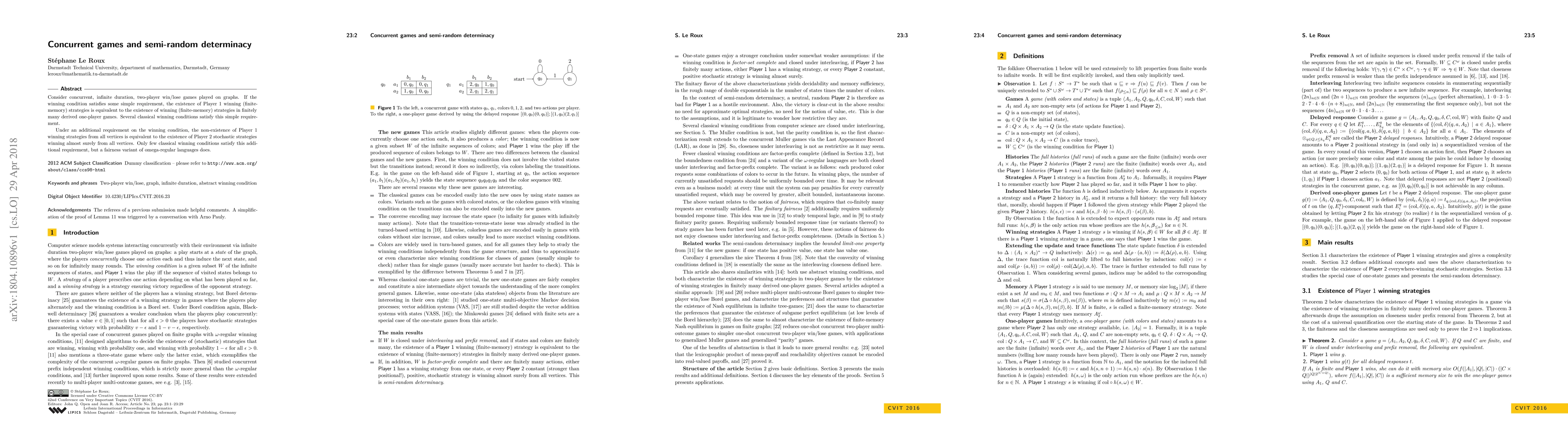 Consider concurrent, infinite duration, two-player win/lose games played on graphs. If the winning condition satisfies some simple requirement, the existence of Player 1 winning (finite-memory) strategies is equivalent to the existence of winning (finite-memory) strategies in finitely many derived one-player games. Several classical winning conditions satisfy this simple requirement. Under an additional requirement on the winning condition, the non-existence of Player 1 winning strategies from all vertices is equivalent to the existence of Player 2 stochastic strategies winning almost surely from all vertices. Only few classical winning conditions satisfy this additional requirement, but a fairness variant of o