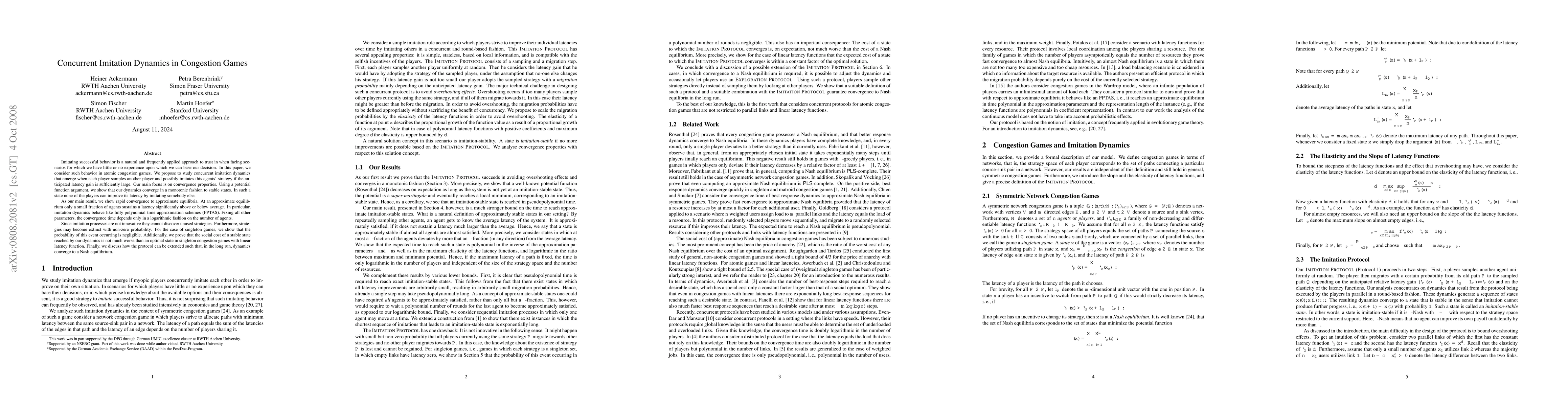 This paper explores concurrent imitation dynamics in atomic congestion games, demonstrating that these dynamics converge rapidly to approximate equilibria. It shows that convergence depends logarithmically on the number of players and that the social cost of stable states is close to optimal, with strategies potentially becoming extinct but rarely in singleton games.