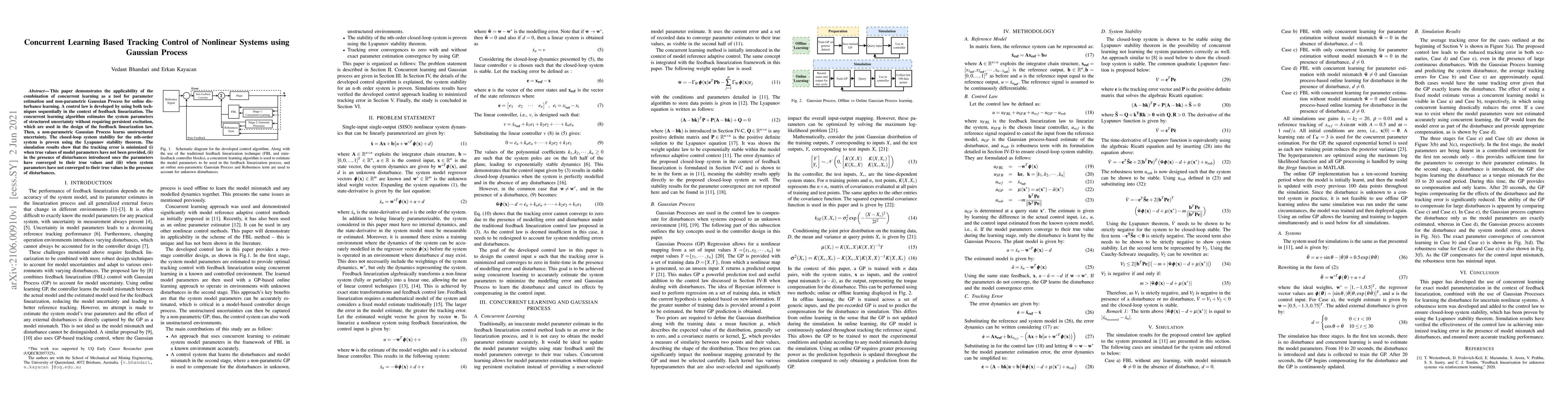 This paper proposes a concurrent learning method combining Gaussian Process for online disturbance learning and feedback linearization to control nonlinear systems. The approach minimizes tracking error even without precise model parameters and in the presence of disturbances.