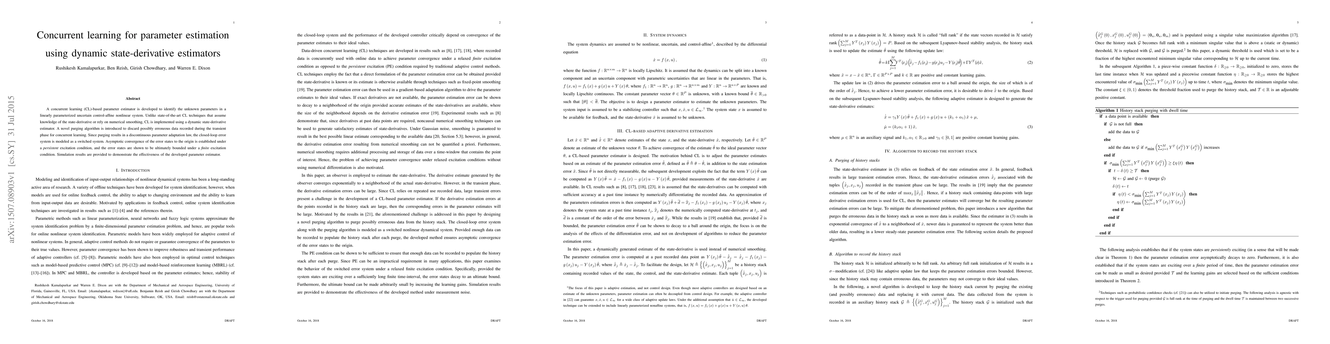 The paper introduces a dynamic state-derivative estimator combined with a purging algorithm for concurrent learning, providing a switched system analysis for the error dynamics.