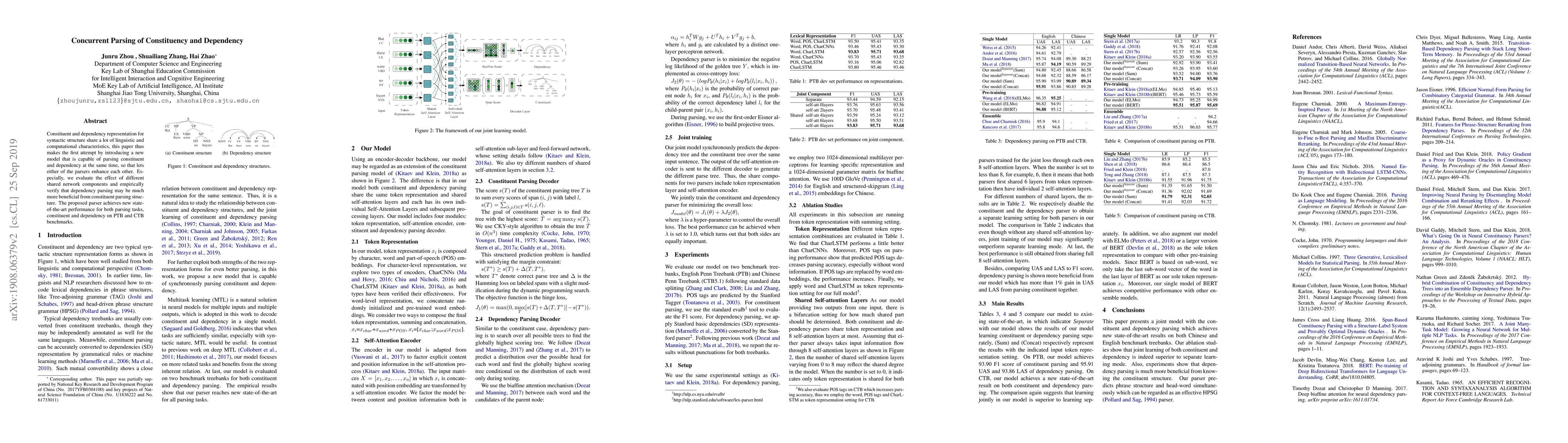 This paper introduces a novel model for parsing both constituency and dependency structures concurrently, demonstrating that shared network components enhance performance. The proposed parser sets new benchmarks in state-of-the-art results for both parsing tasks on PTB and CTB datasets.